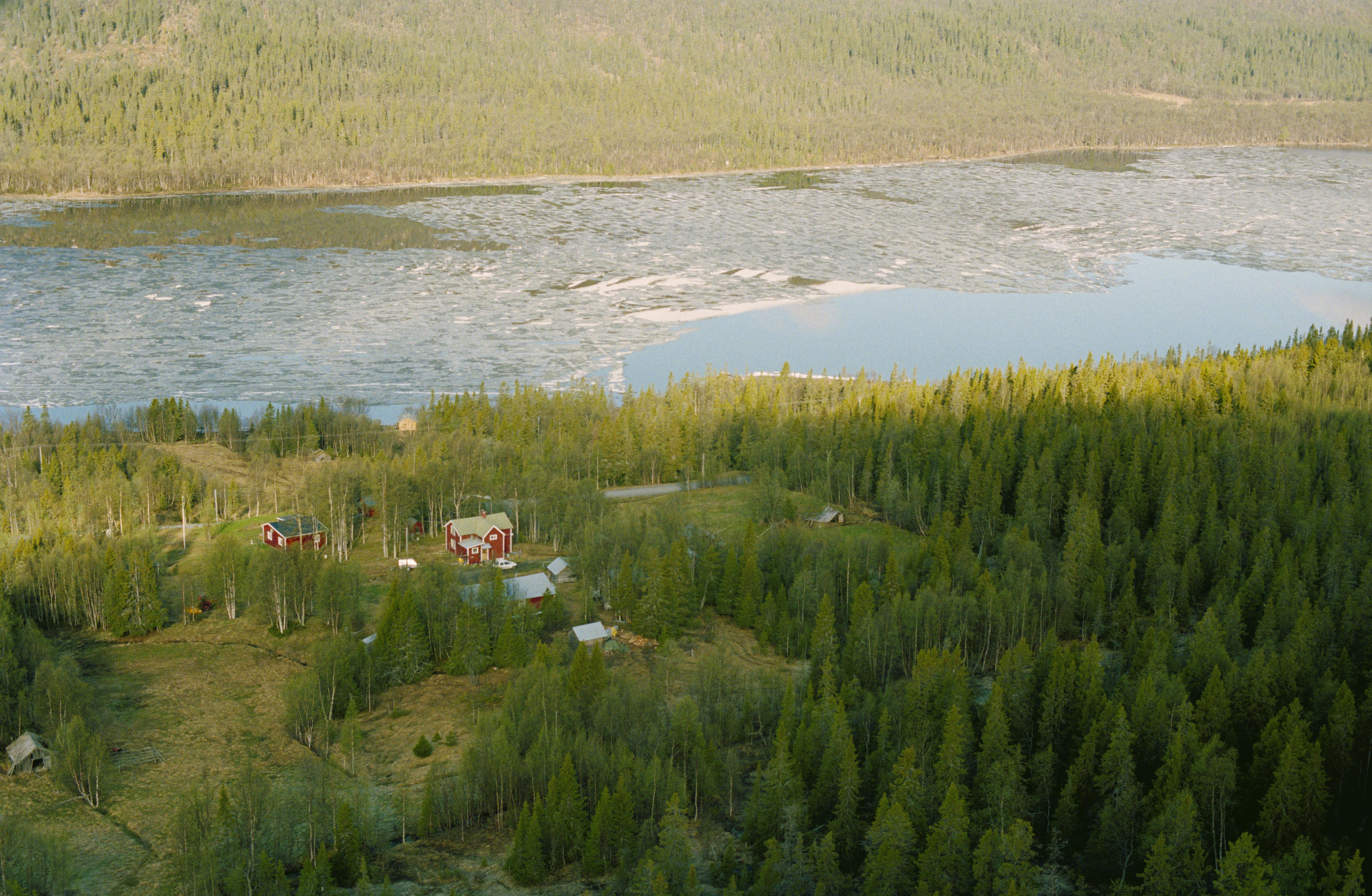 Beskrivning: Gikasjön. En gård vid östra stranden, söder om Grundfors by. Vid stranden på sjöns västra sida (över bildens mitt) fångstgrop RAÄnr Vilhelmina 1103:1, boplats Vilhelmina 1112:1 m.m. Bilden är tagen mot (väderstreck): V