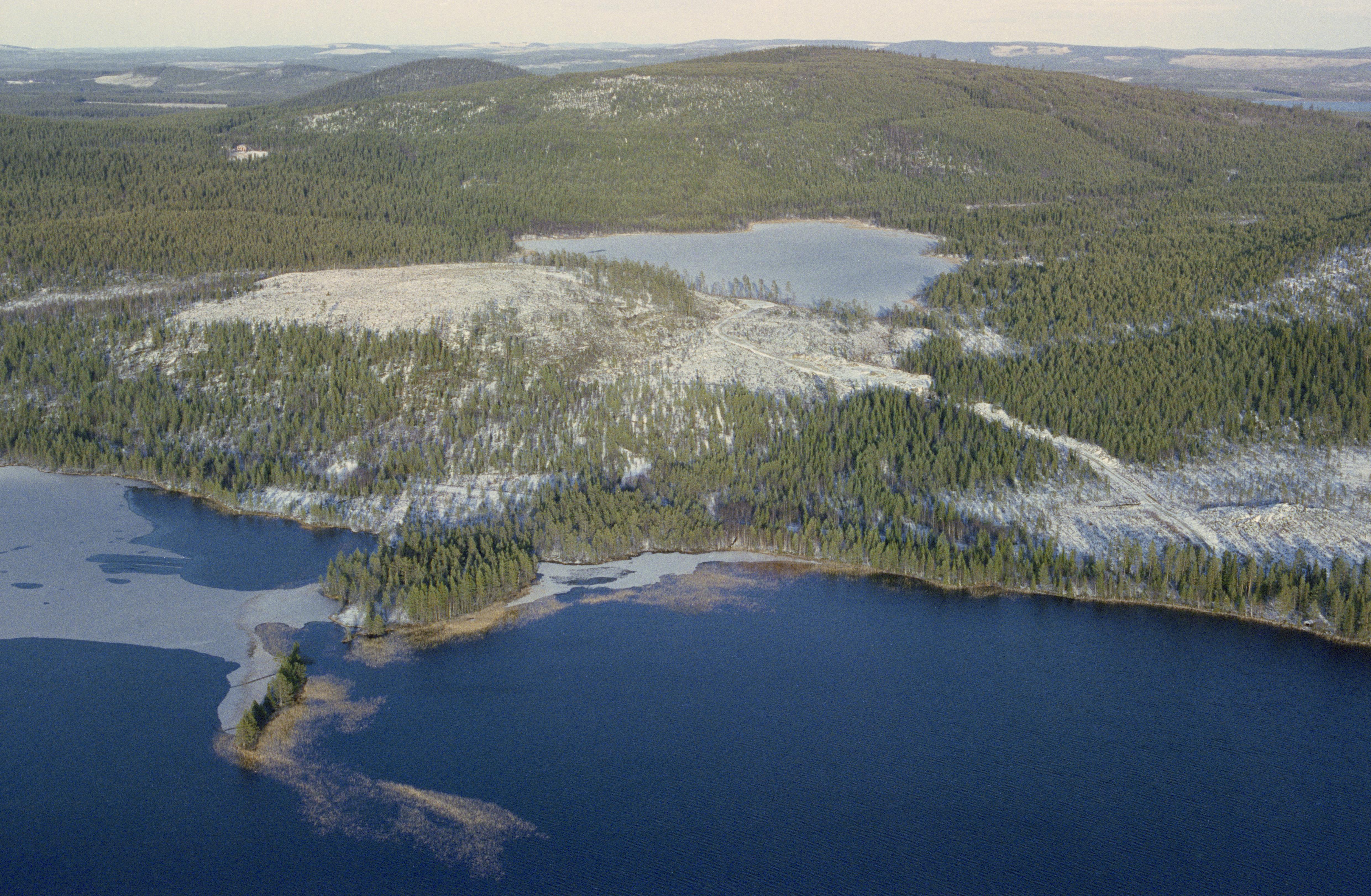 Beskrivning: Norra delen av Sämsjön. På udden i bildens nedre del boplats RAÄnr Dorotea 731 m.m. Vid bildens mitt gränsen mot Åsele socken. Över bildens mitt Storberget med hällmålning RAÄnr Åsele 151:1 vid Säljbergtjärnen. Bilden är tagen mot (väderstreck): NNO