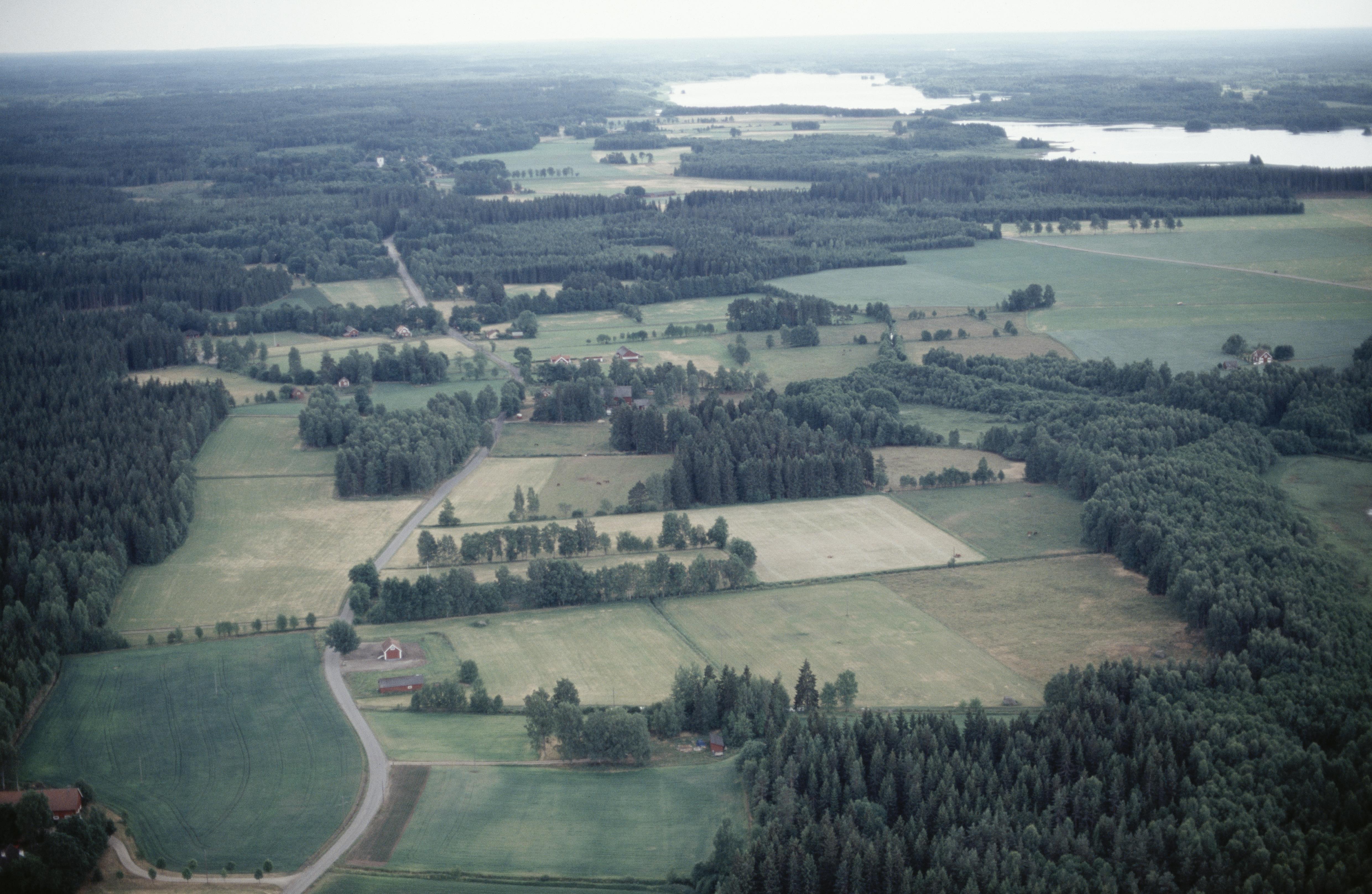 Beskrivning: Stenkammargrav RAÄnr Virestad 123:1 vid bildens mitt. I bildens övre del Virestadsjön, Virestads kyrka och kyrkby. Bilden är tagen mot (väderstreck): S