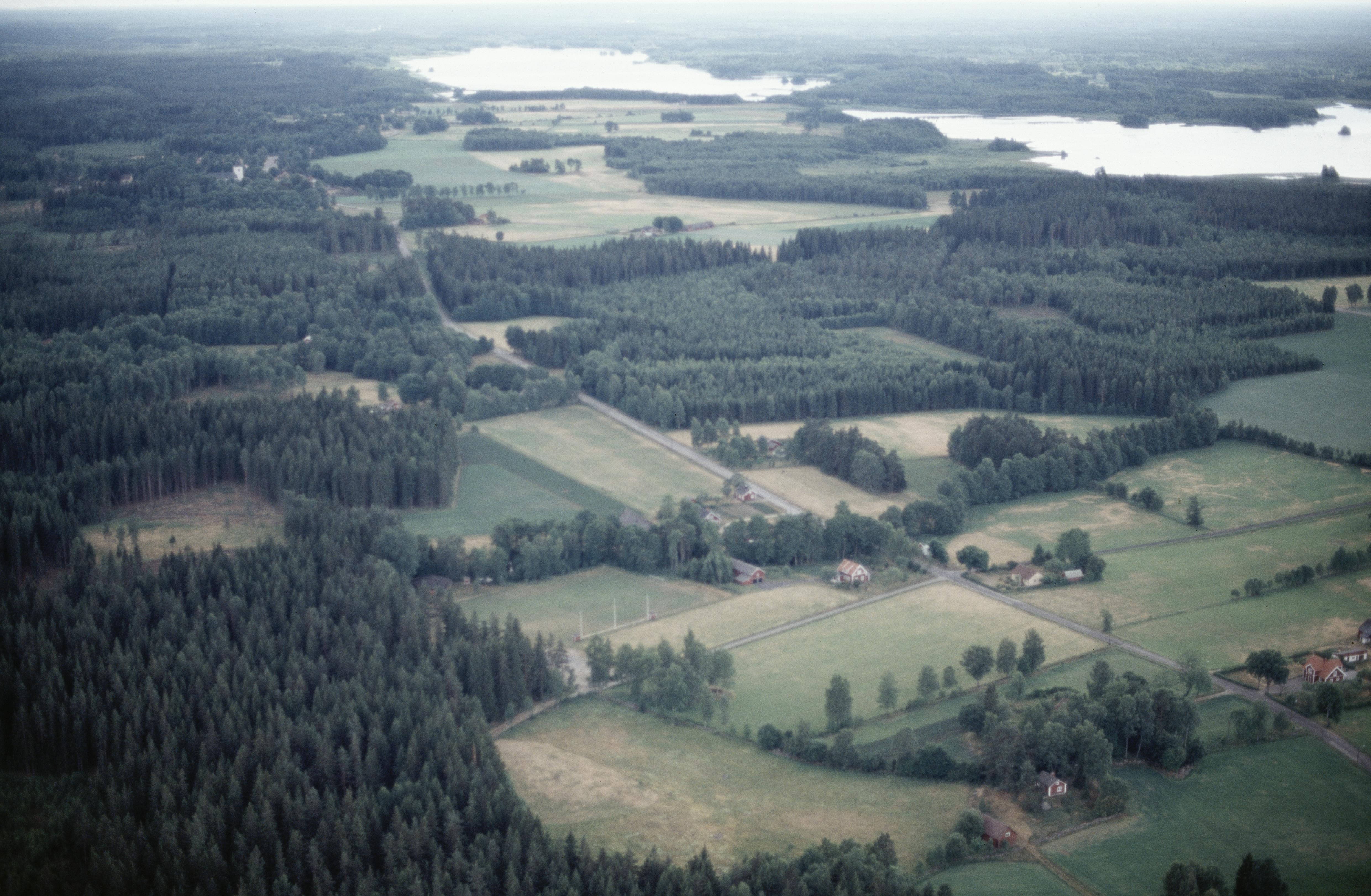 Beskrivning: Stenkammargrav RAÄnr Virestad 123:1 vid bildens mitt. I bildens övre del Virestadsjön, Virestads kyrka och kyrkby. Bilden är tagen mot (väderstreck): S