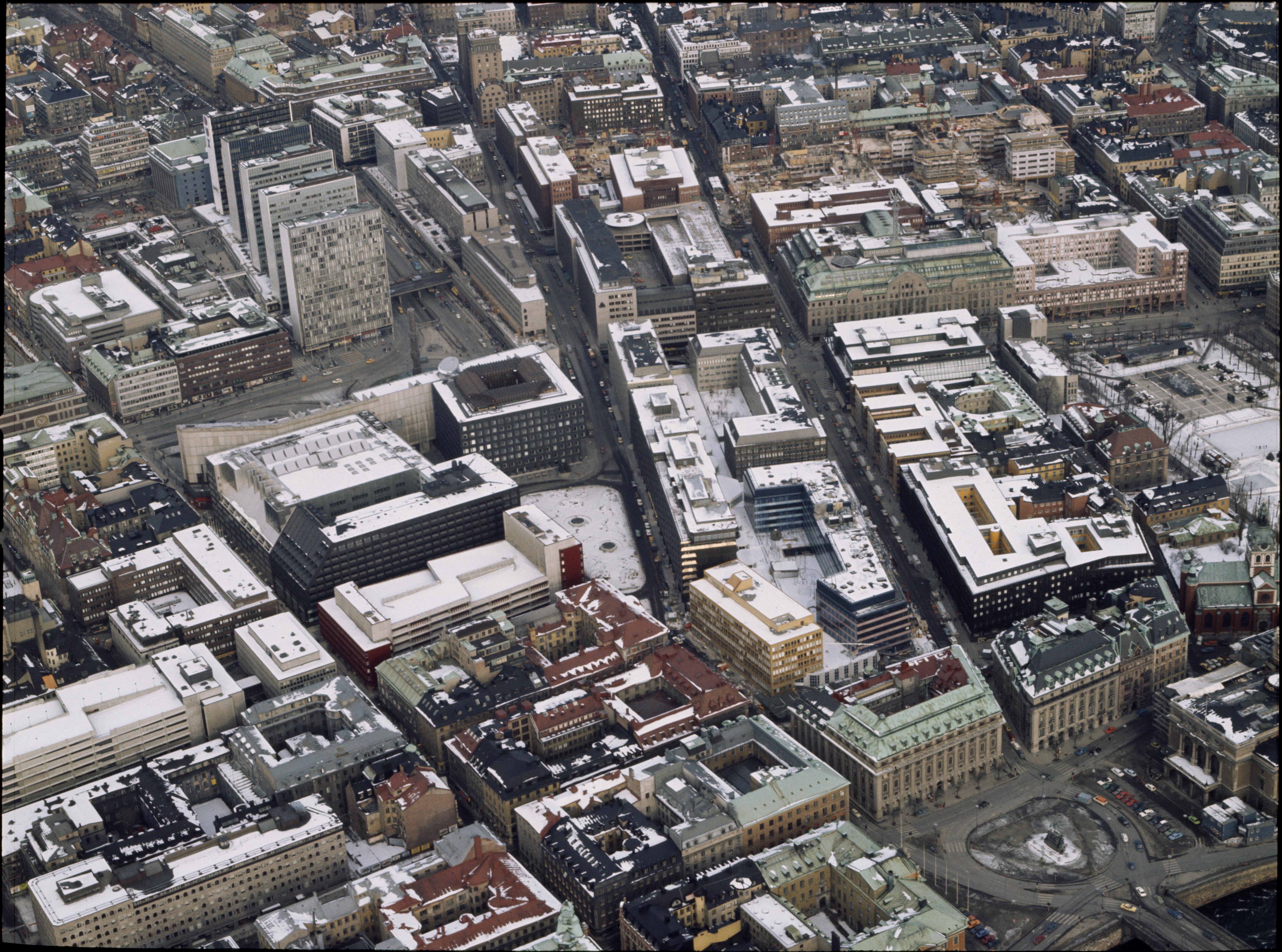 Beskrivning: Brunkebergstorg med Riksbanken, Kungsträdgården, Hötorgsskraporna, Gustav Adolfs torg. City. Rivningar