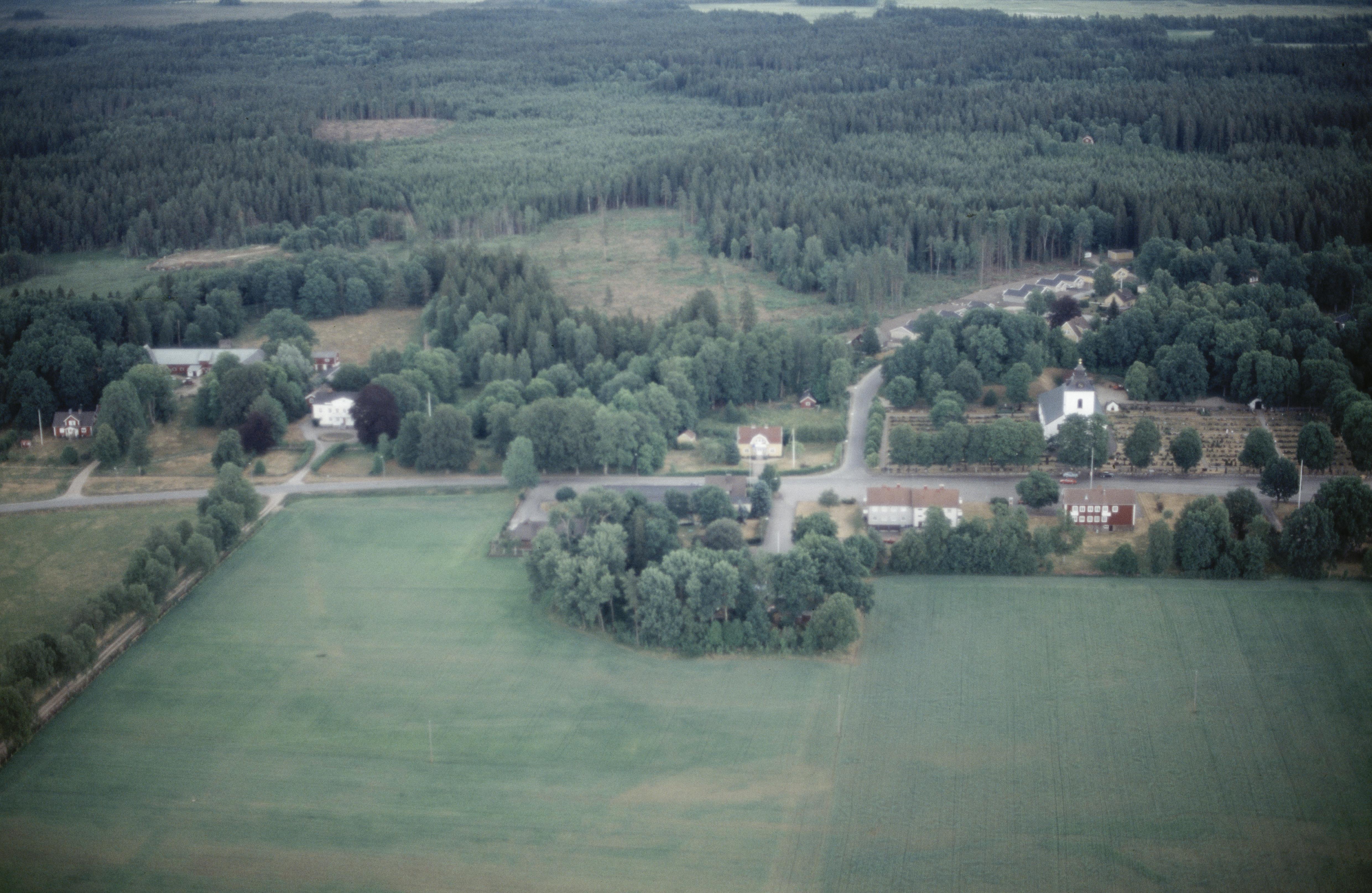 Beskrivning: Virestads kyrka och kyrkby. Bilden är tagen mot (väderstreck): Ö