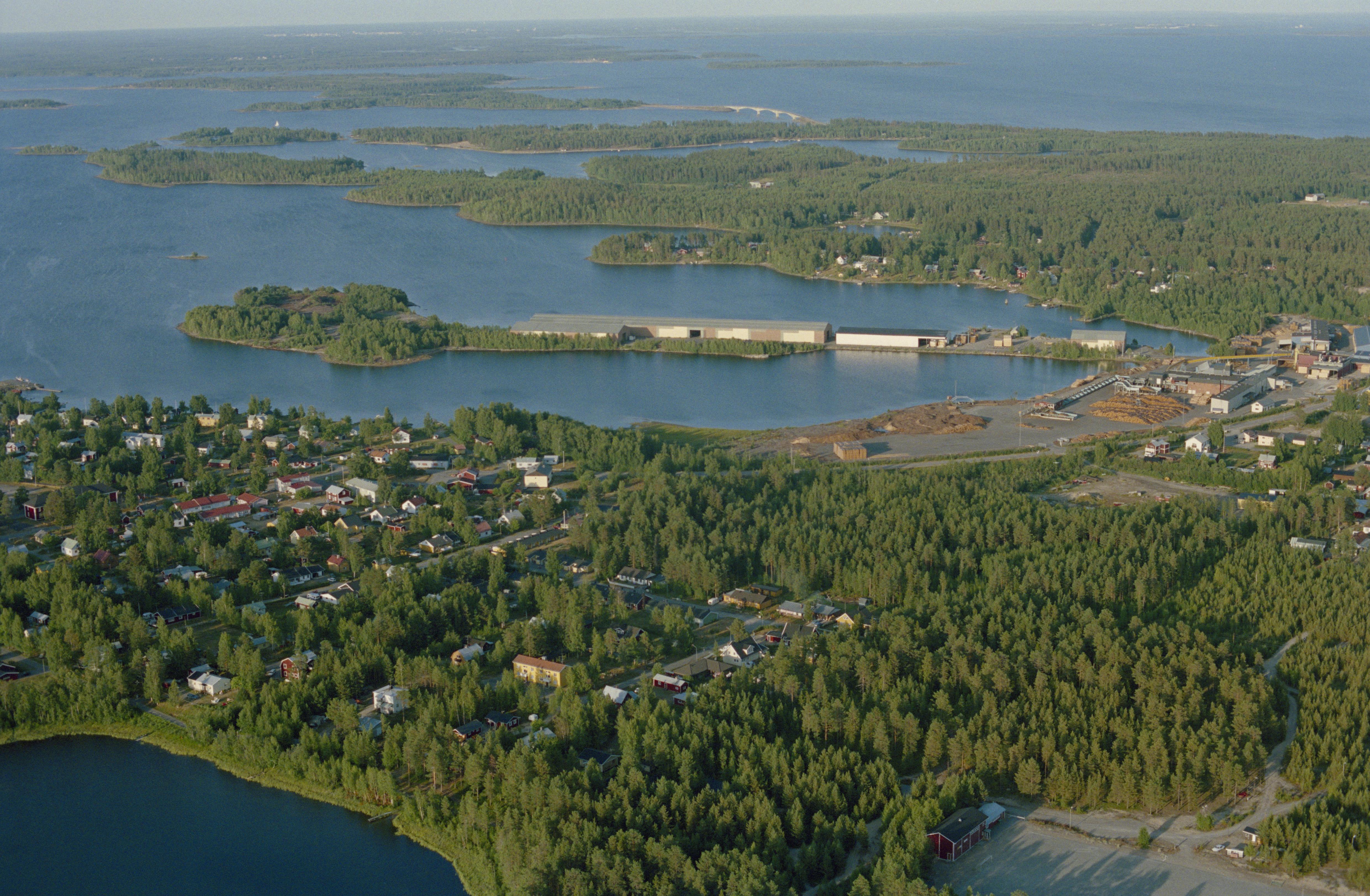 Beskrivning: Seskarö tätort, kyrkby och sågbrukssamhälle i norra delen av ön Seskarö (Seittenkaari) i Haparanda skärgård. Uppe till höger hamnen RAÄnr Nedertorneå 143:1 vid långa udden Lannaska. Bilden är tagen mot (väderstreck): ONO