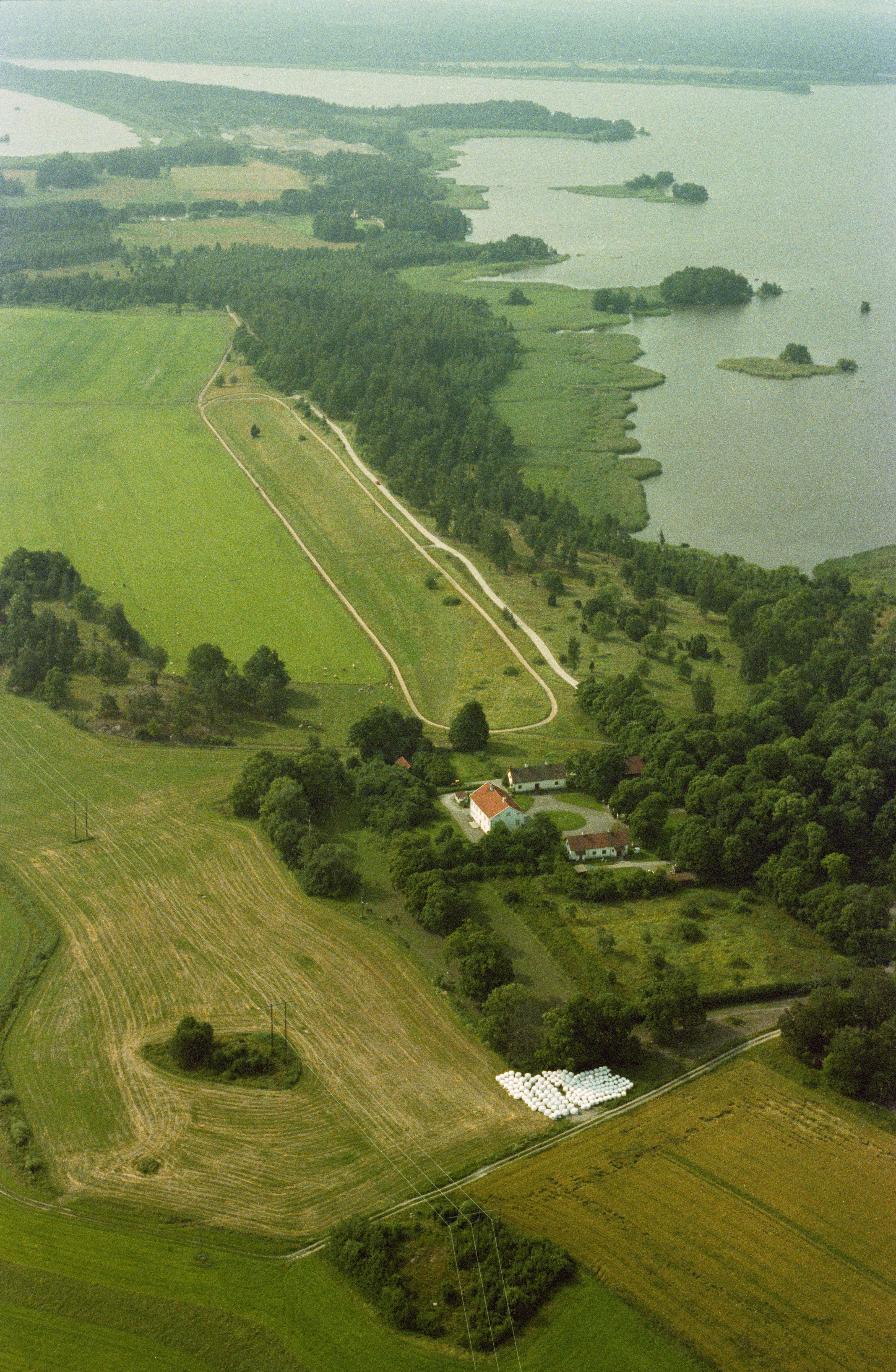 Beskrivning: Skävesunds herrgård vid sjön Hjälmaren. Gravfält RAÄnr Glanshammar 2:1, 3:1 vid Gubbskogen och Norra Skäret vid bildens mitt. På udden i bildens övre del Äsön i Stora Mellösa socken. Bilden är tagen mot (väderstreck): SSV