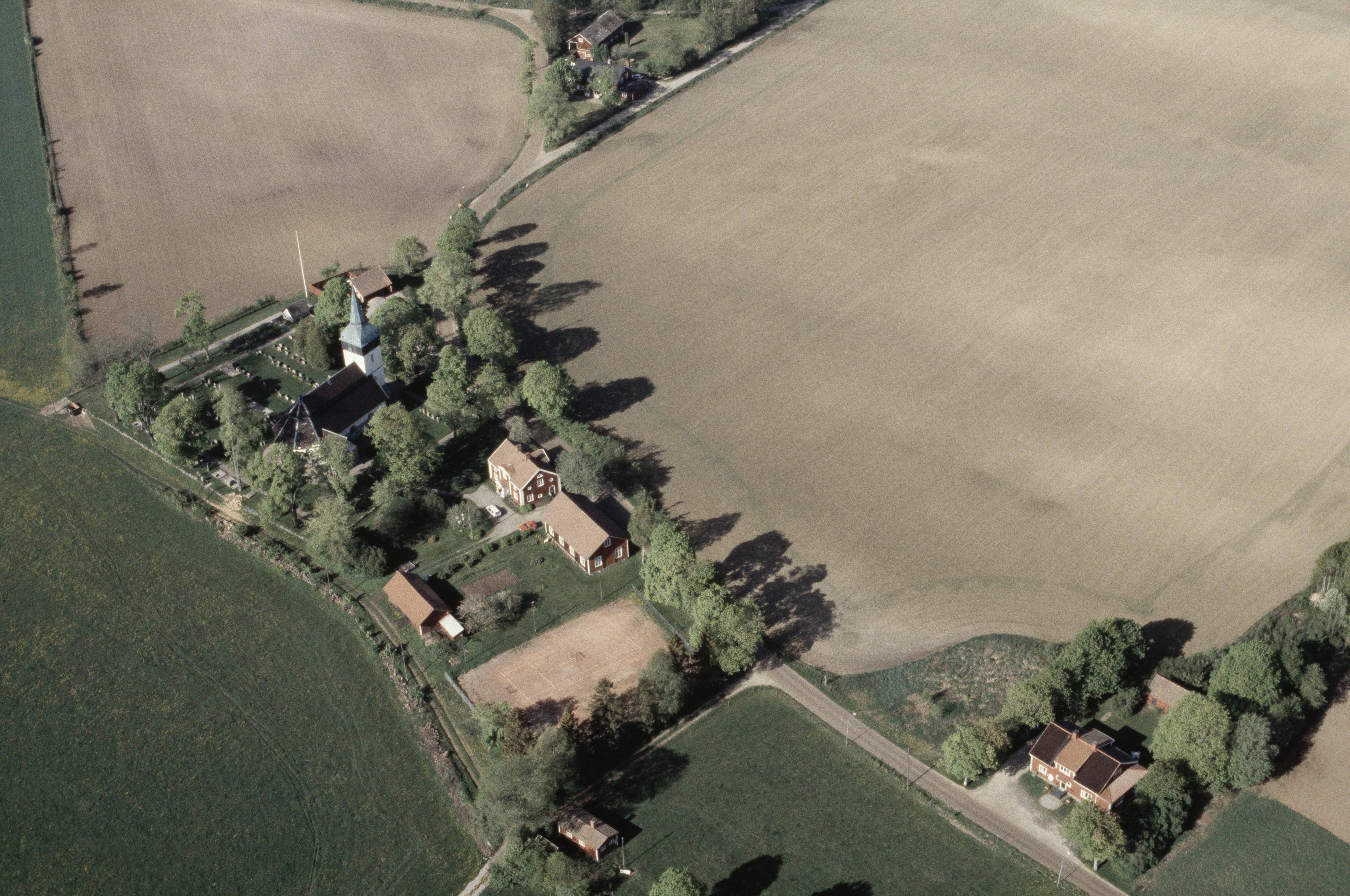 Beskrivning: Hackvads kyrka i drumlinområdet. Bilden är tagen mot (väderstreck): SV