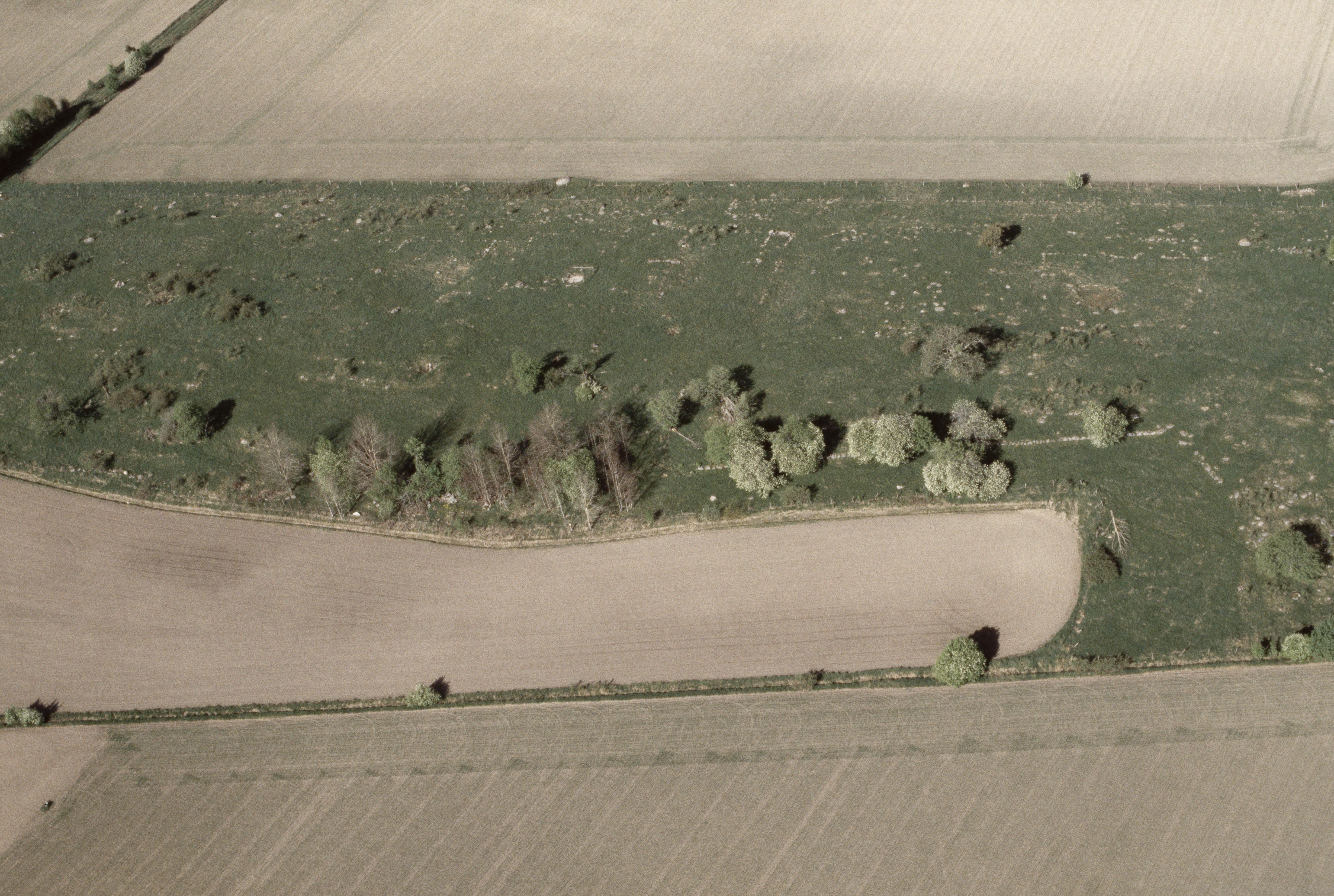 Beskrivning: Drumlinområde. Tjugesta gamla tomt RAÄnr Hackvad 34:1. Här låg under medeltiden ett trettiotal byggnader. Bilden är tagen mot (väderstreck): V