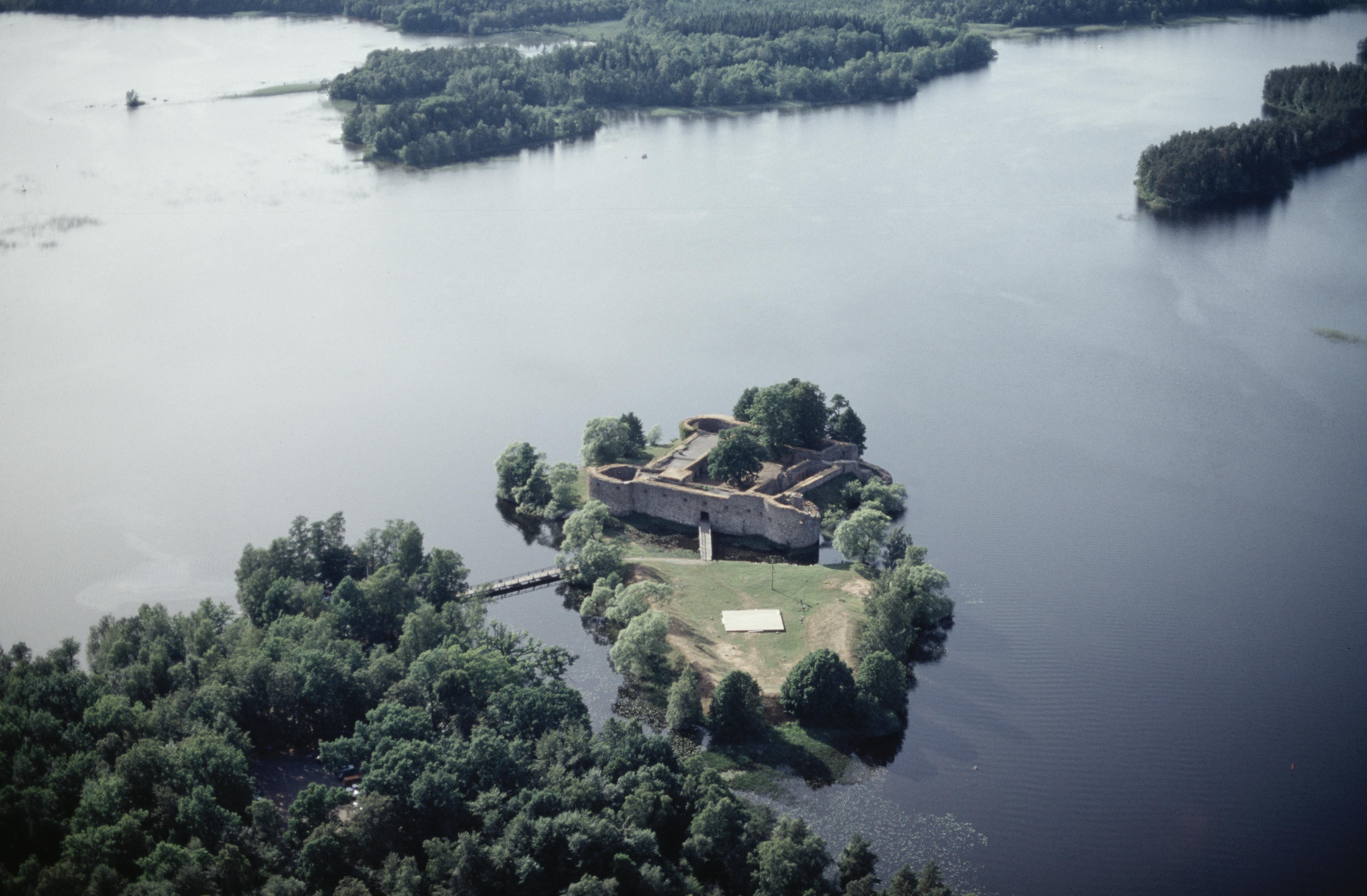 Beskrivning: Kronobergs slottsruin RAÄnr Växjö 93:1 vid Helgasjön. Befäst anläggning, borgområde, bestående av slottsruin uppförd i gråsten samt 2 förborgar. Bilden är tagen mot (väderstreck): NV
