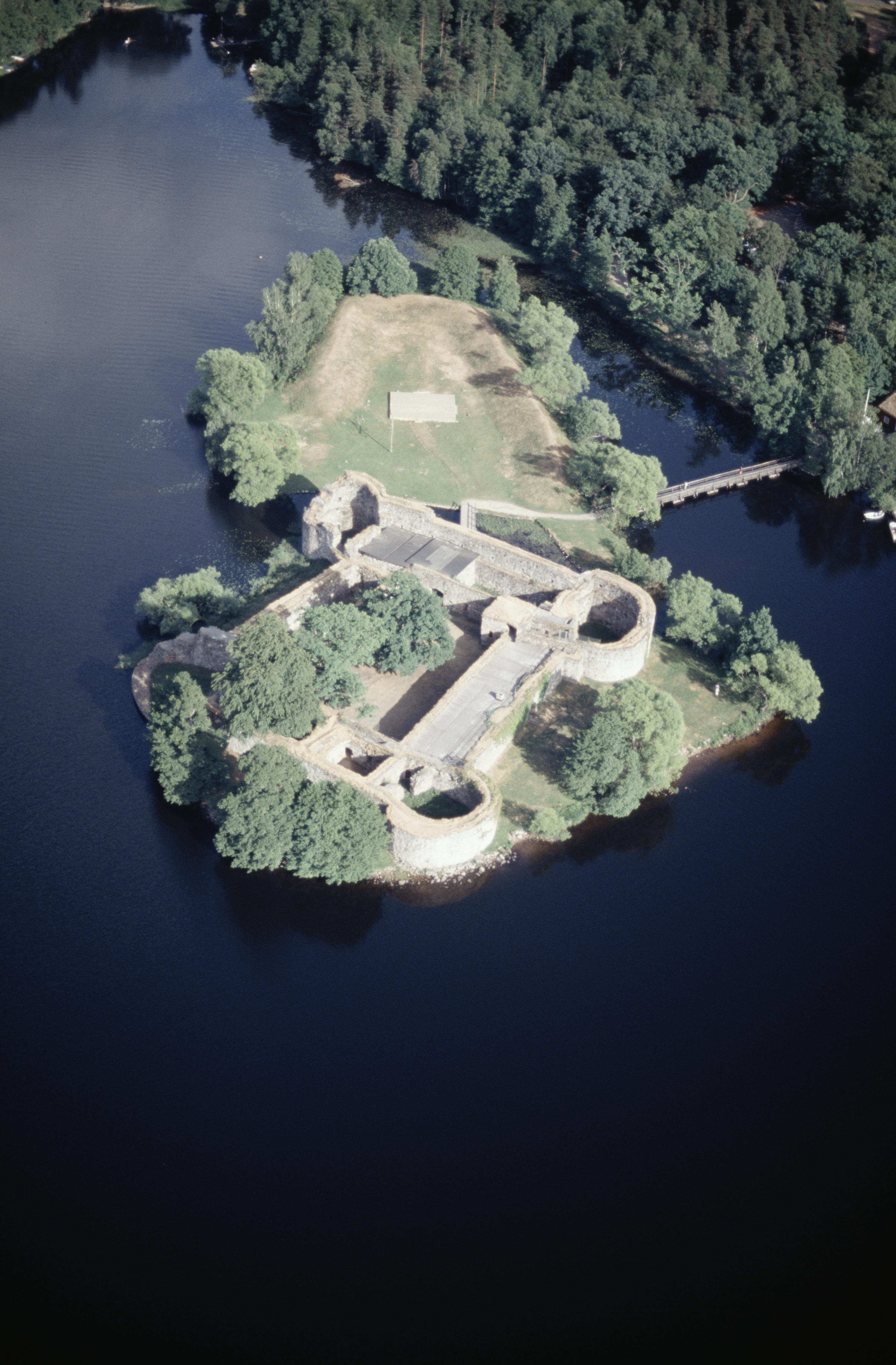Beskrivning: Kronobergs slottsruin RAÄnr Växjö 93:1 vid Helgasjön. Befäst anläggning, borgområde, bestående av slottsruin uppförd i gråsten samt 2 förborgar. Bilden är tagen mot (väderstreck): SO