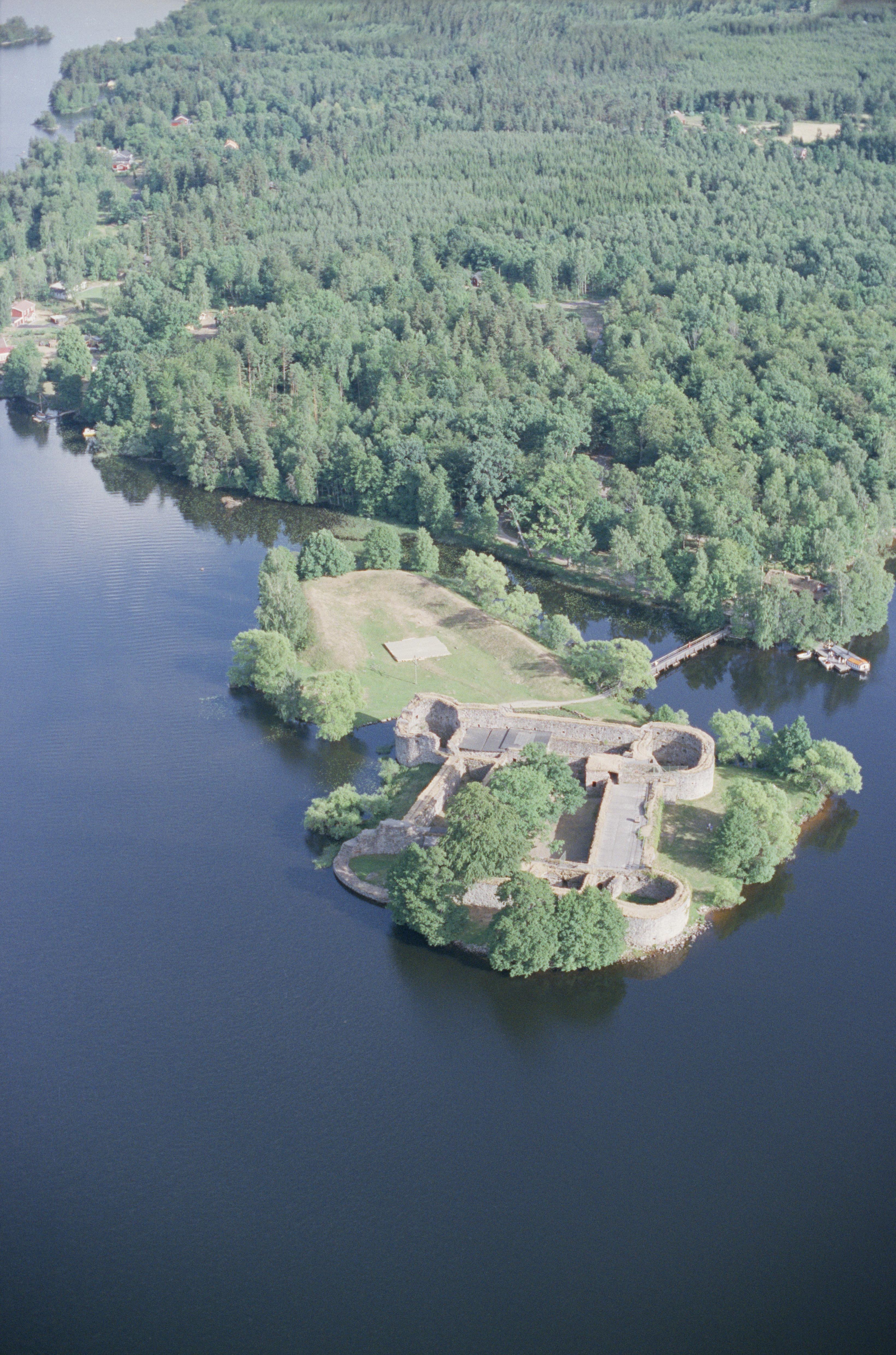 Beskrivning: Kronobergs slottsruin RAÄnr Växjö 93:1 vid Helgasjön. Befäst anläggning, borgområde, bestående av slottsruin uppförd i gråsten samt 2 förborgar. Bilden är tagen mot (väderstreck): SO