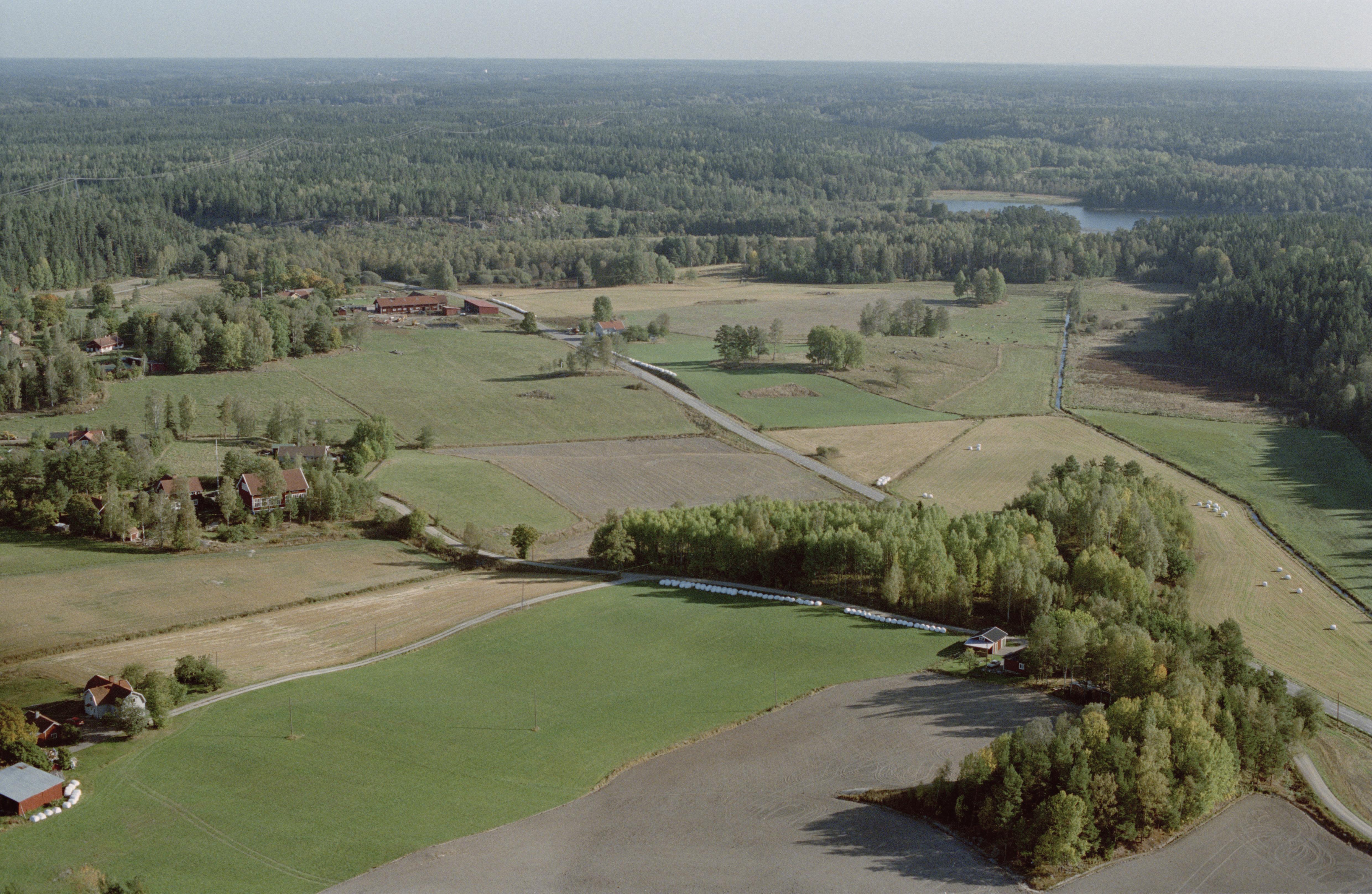Beskrivning: Eriksgatan (på sträckan Önnersta - Penningby) vid Stene by. Uppe till vänster gravfält Björnlunda 151:1. I bildens nedre del området vid runristning på block RAÄnr Björnlunda 155:1. Bilden är tagen mot (väderstreck): Ö