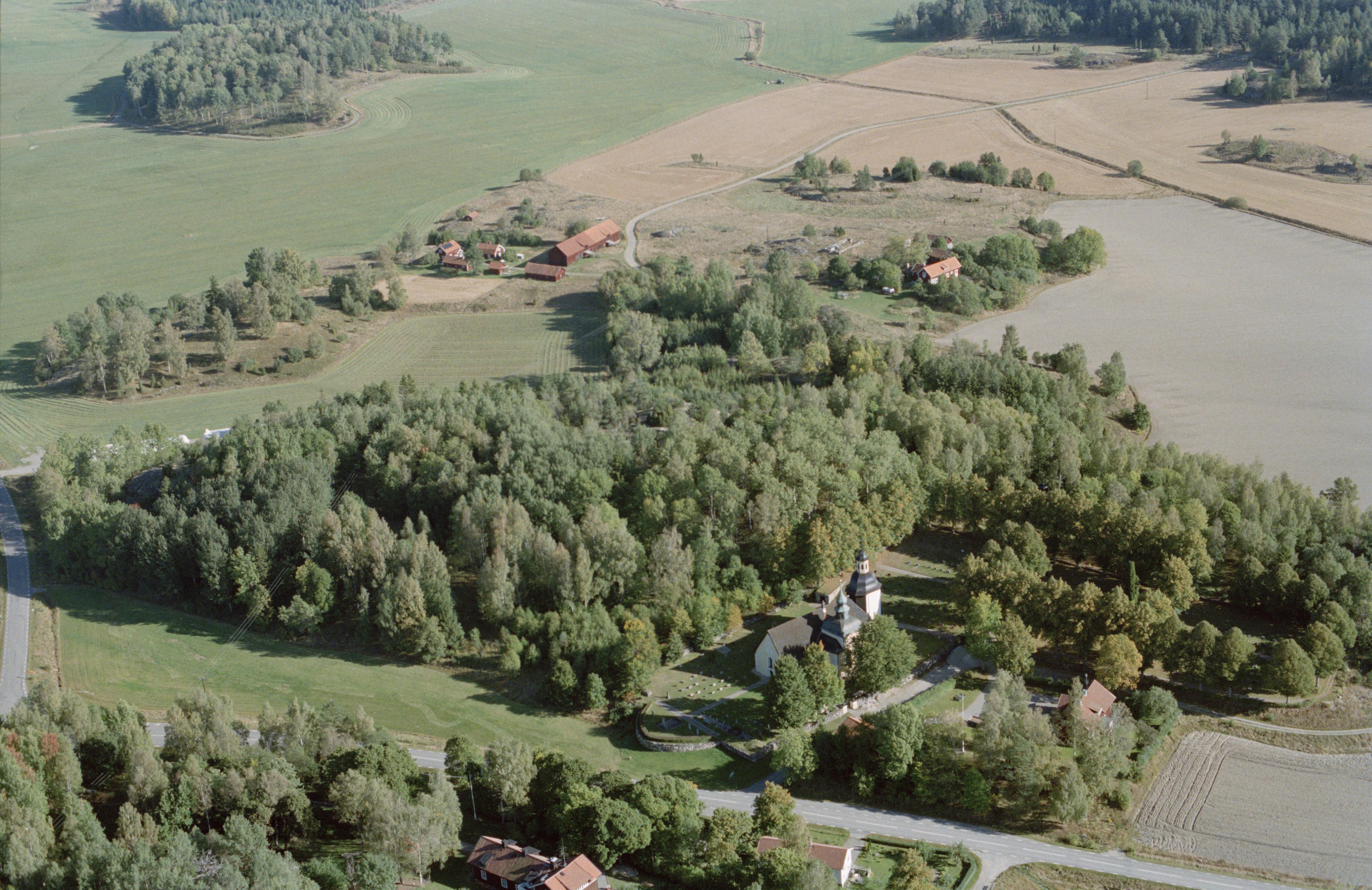 Beskrivning: Bälinge kyrka vid Klockarberget med stensättning RAÄnr Bälinge 136:1. Bilden är tagen mot (väderstreck): NO