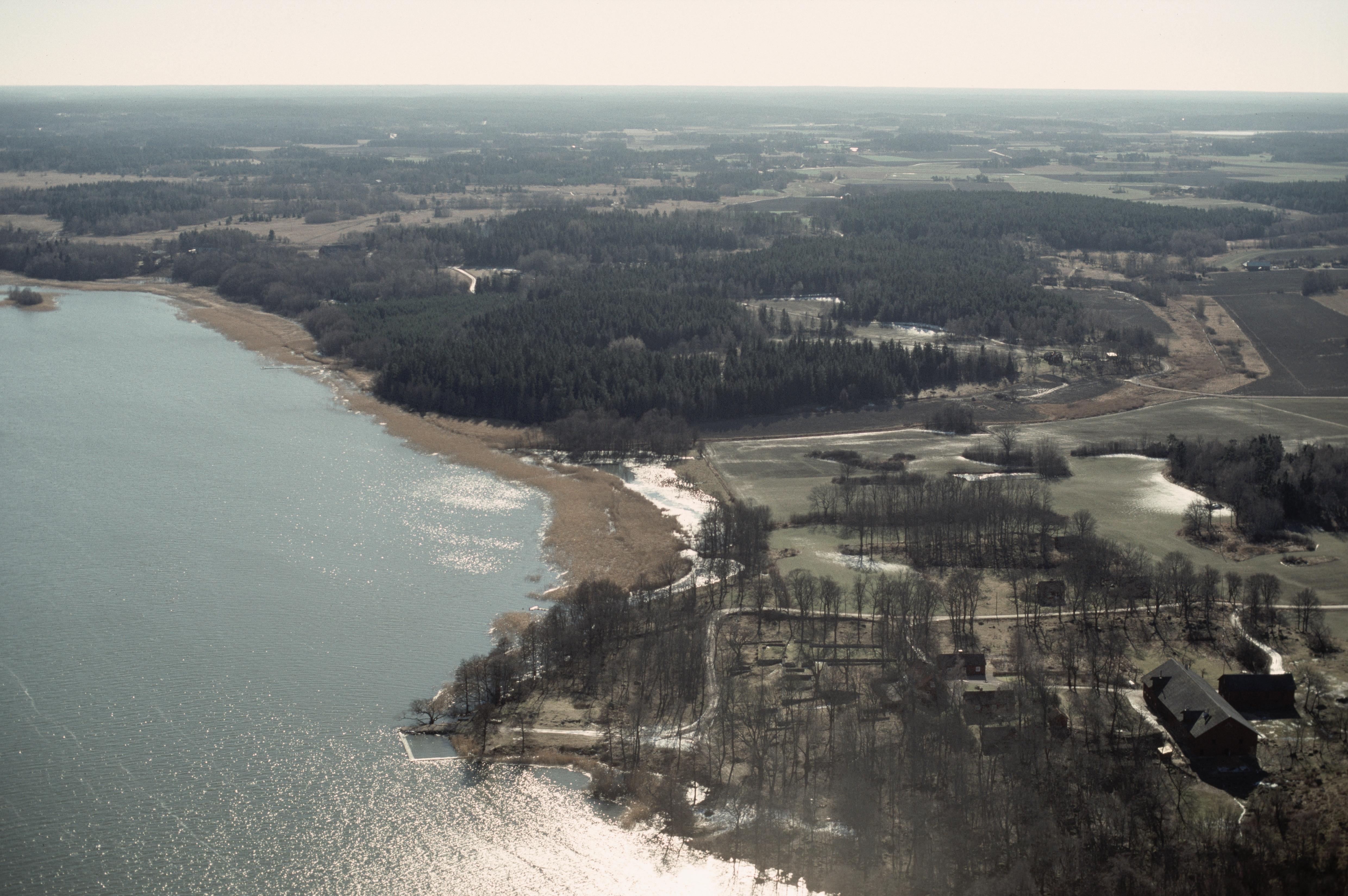Beskrivning: Vårfruberga kloster (ruin) RAÄnr Fogdö 30:1 och Kungsbergs herrgård / kungsgård Fogdö 230:1. Fornlämningsområde på Fogdön vid Strängnäsfjärden i Mälaren. I bildens övre del Vansö socken. Bilden är tagen mot (väderstreck): S