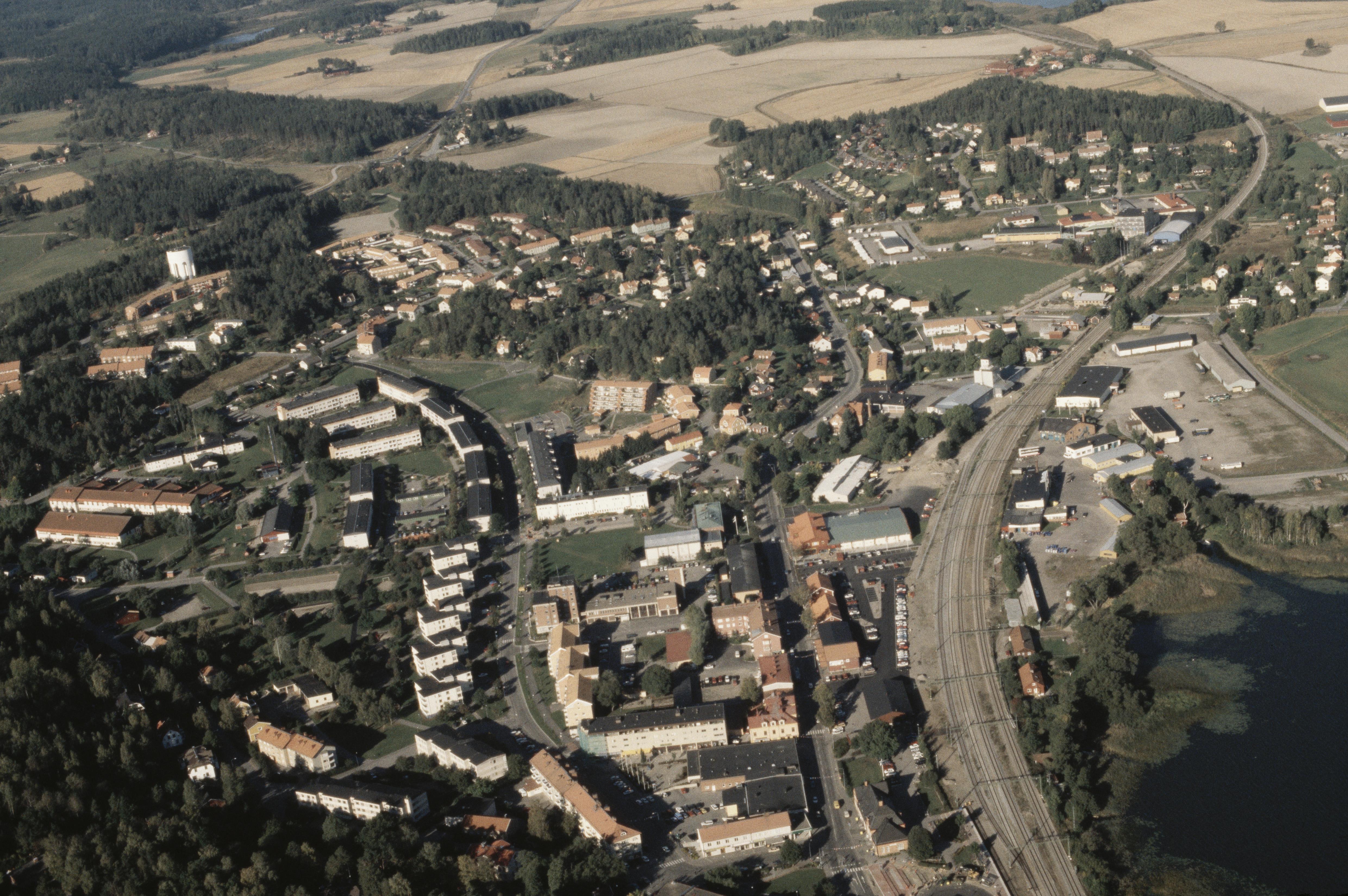 Beskrivning: Gnesta tätort. Gnesta järnvägsstation till höger. Bilden är tagen mot (väderstreck): VNV
