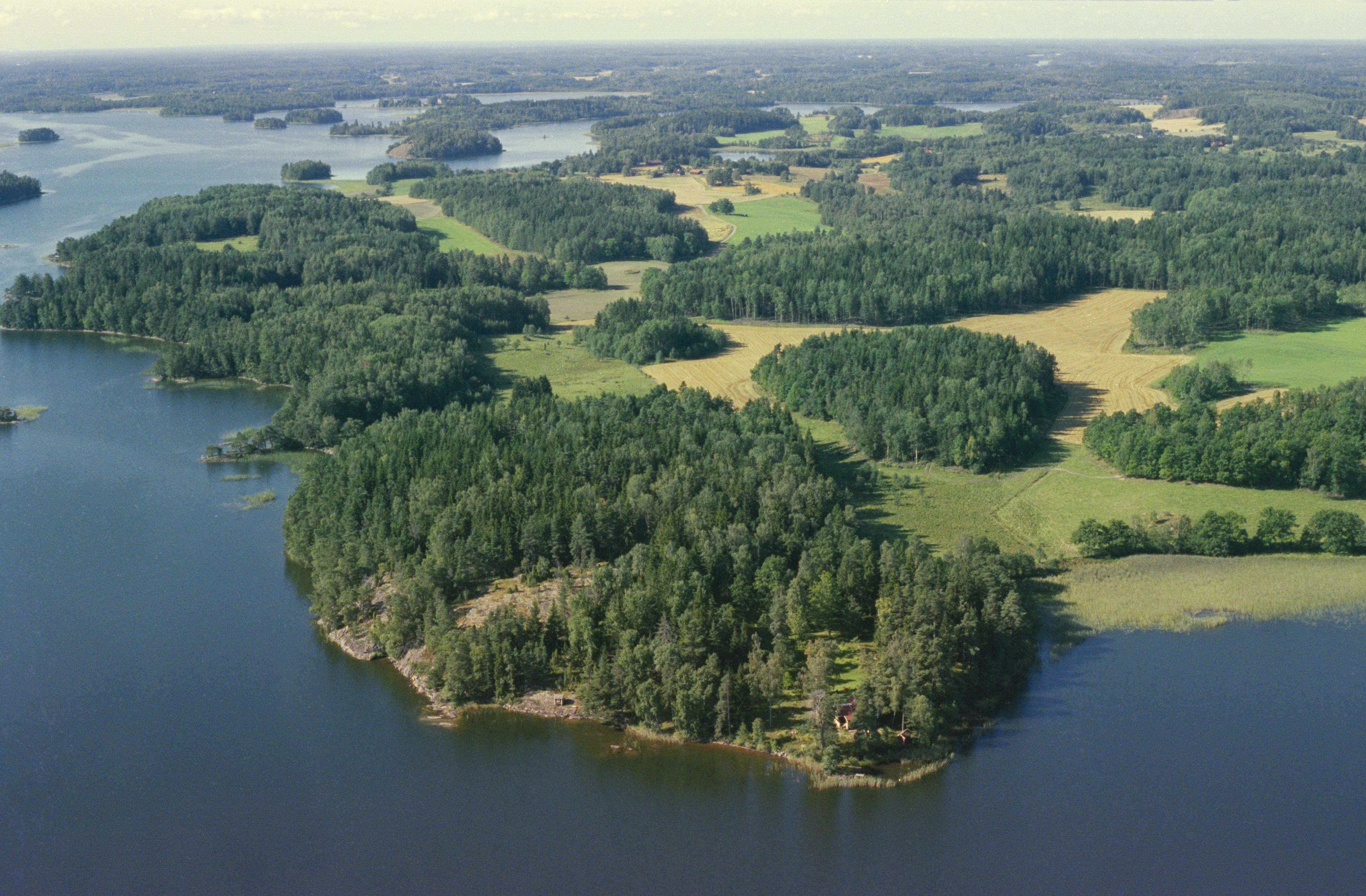 Beskrivning: Vid bildens mitt Björkudden vid Sörbyviken i sjön Båven. På udden fornborg Sörby RAÄnr Helgesta 118:1. Bilden är tagen mot (väderstreck): SV