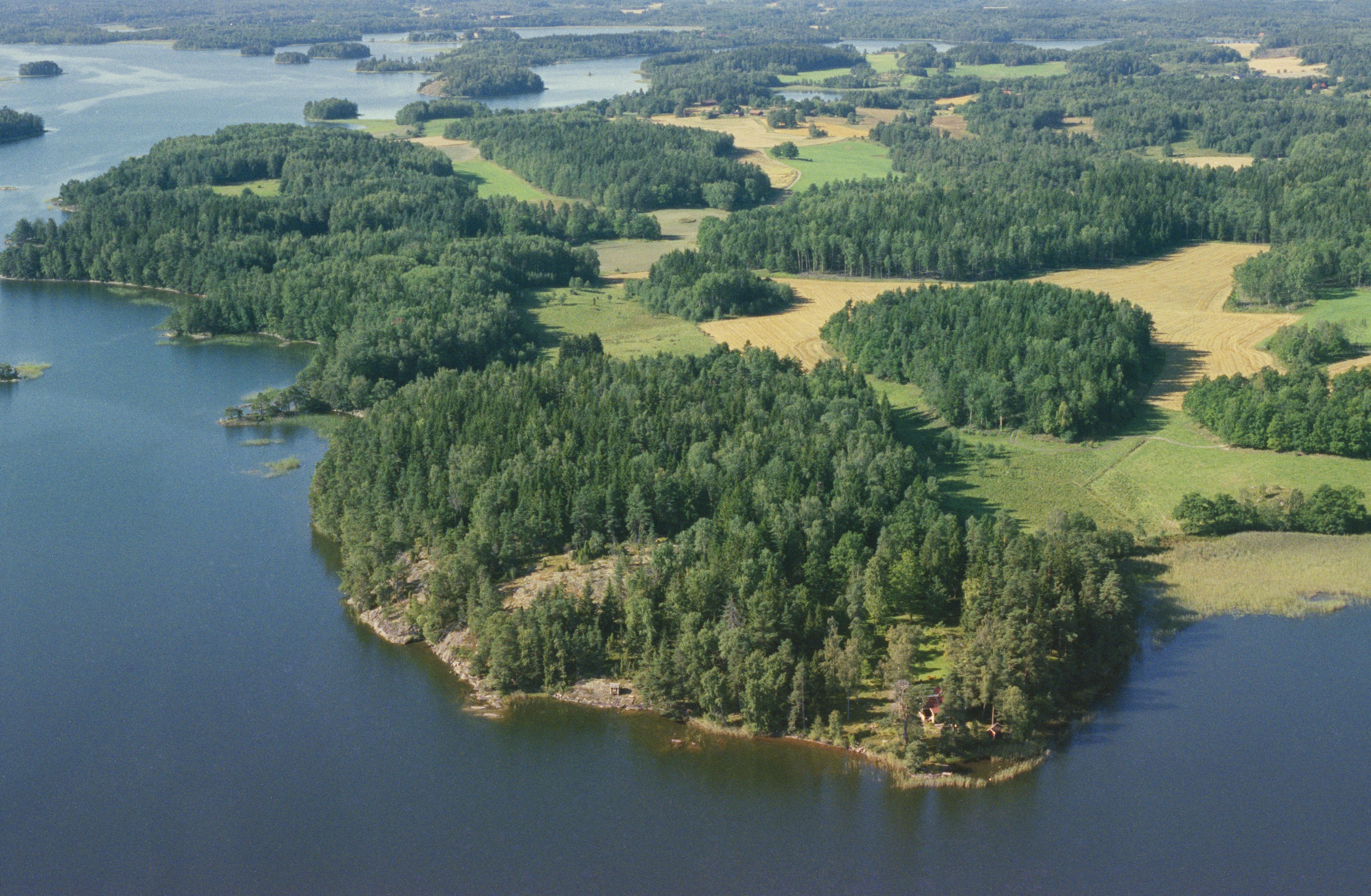 Beskrivning: Vid bildens mitt Björkudden vid Sörbyviken i sjön Båven. På udden fornborg Sörby RAÄnr Helgesta 118:1. Bilden är tagen mot (väderstreck): SV