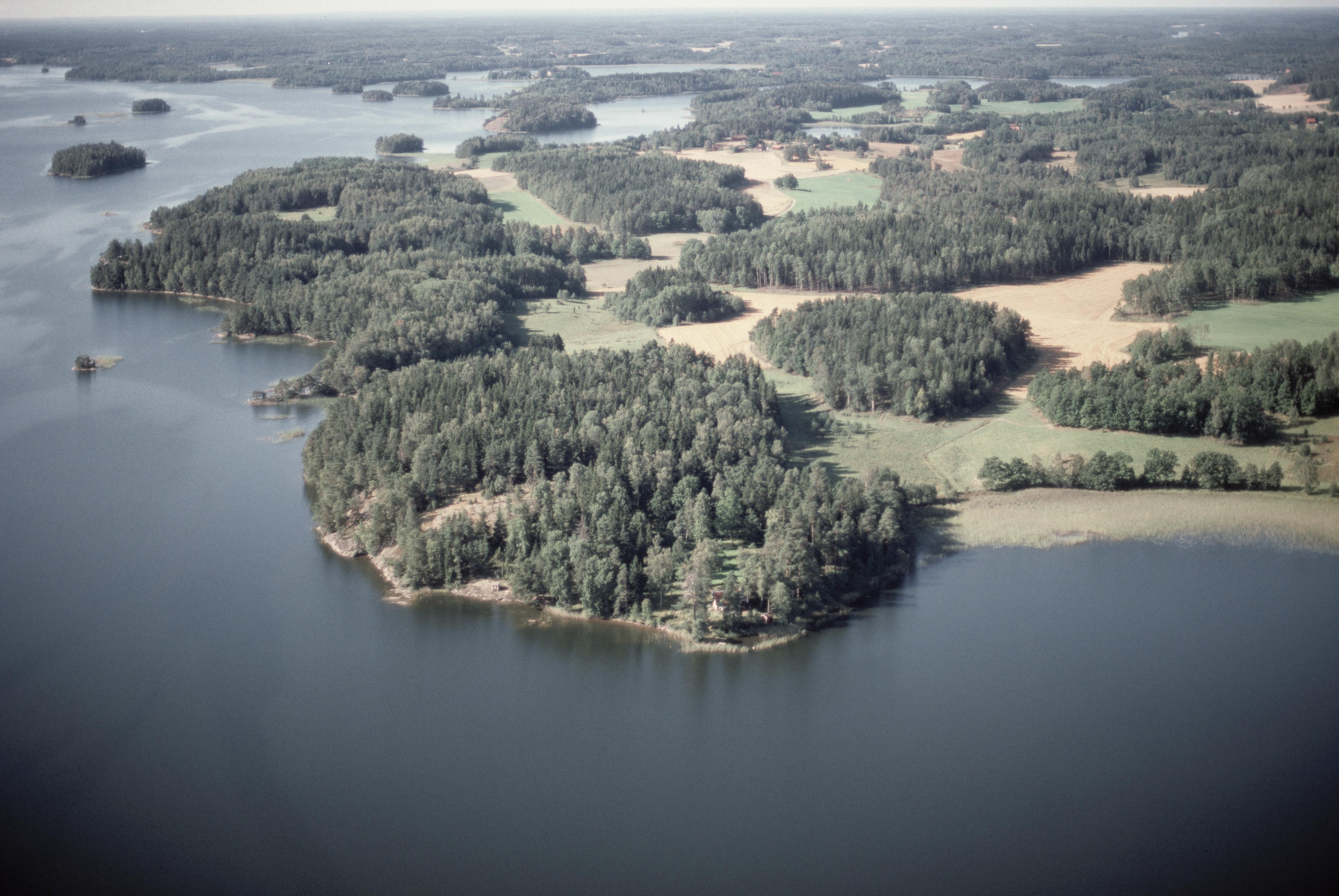Beskrivning: Vid bildens mitt Björkudden vid Sörbyviken i sjön Båven. På udden fornborg Sörby RAÄnr Helgesta 118:1. Bilden är tagen mot (väderstreck): SV