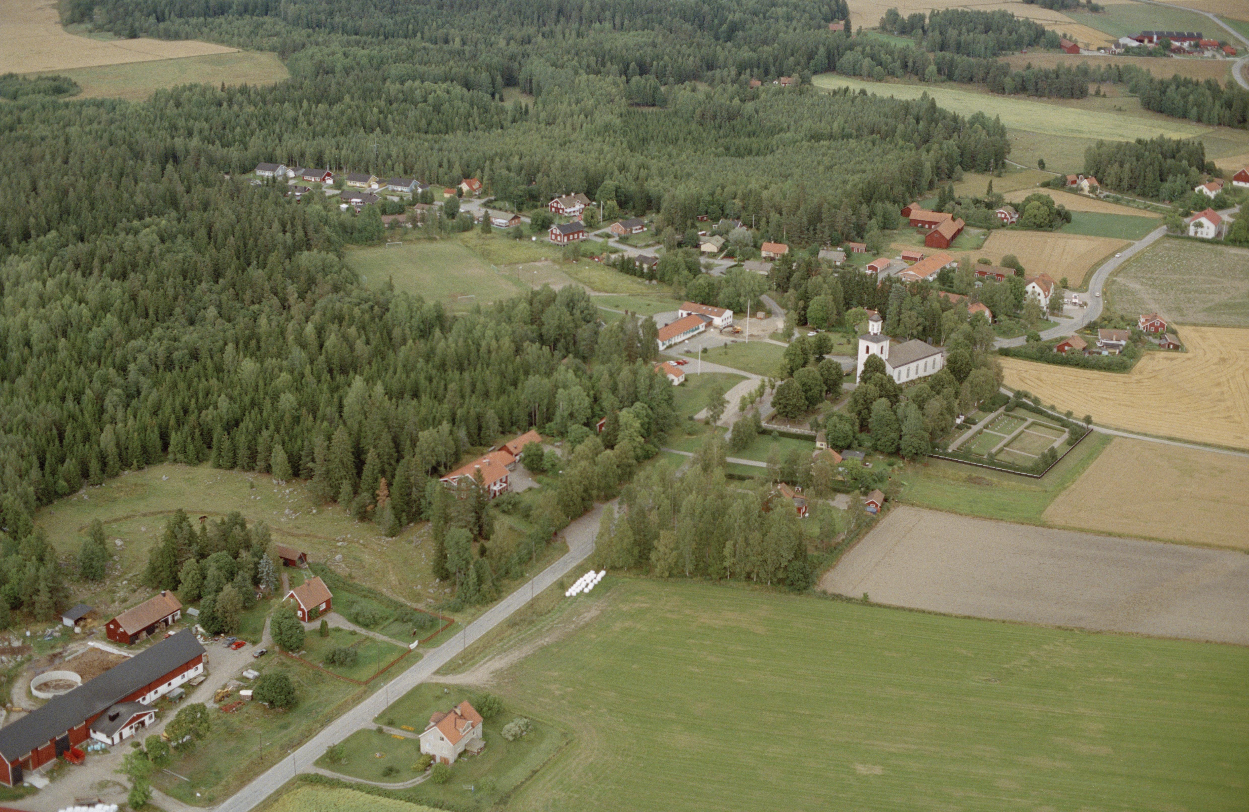 Beskrivning: Huddunge kyrka och kyrkby i Vretaåns dalgång. Bilden är tagen mot (väderstreck): NNO