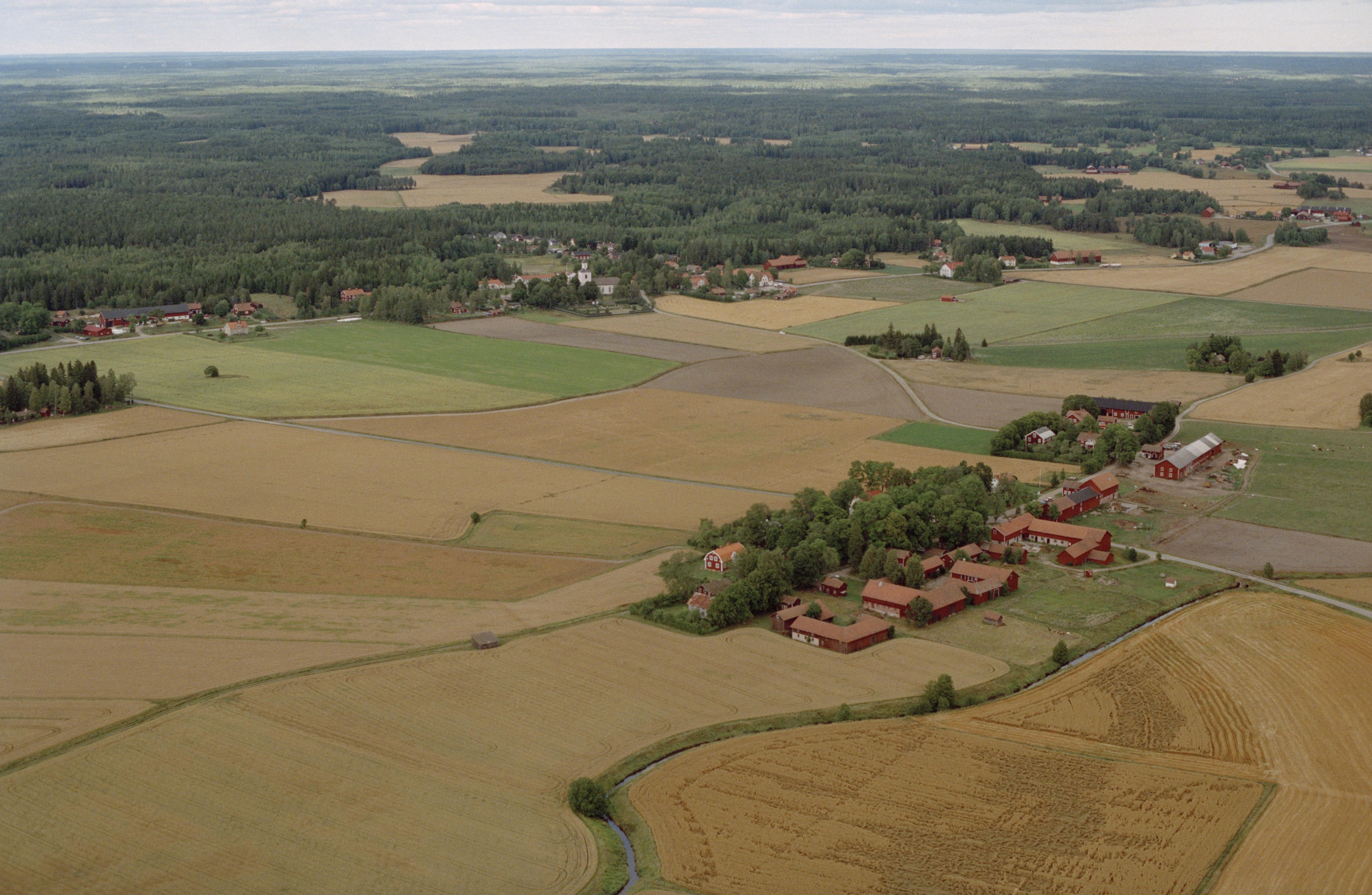 Beskrivning: Vretaåns dalgång. Vid bildens mitt radbyn Huddungeby. I bildens övre del Huddunge kyrka och kyrkby. Bilden är tagen mot (väderstreck): N
