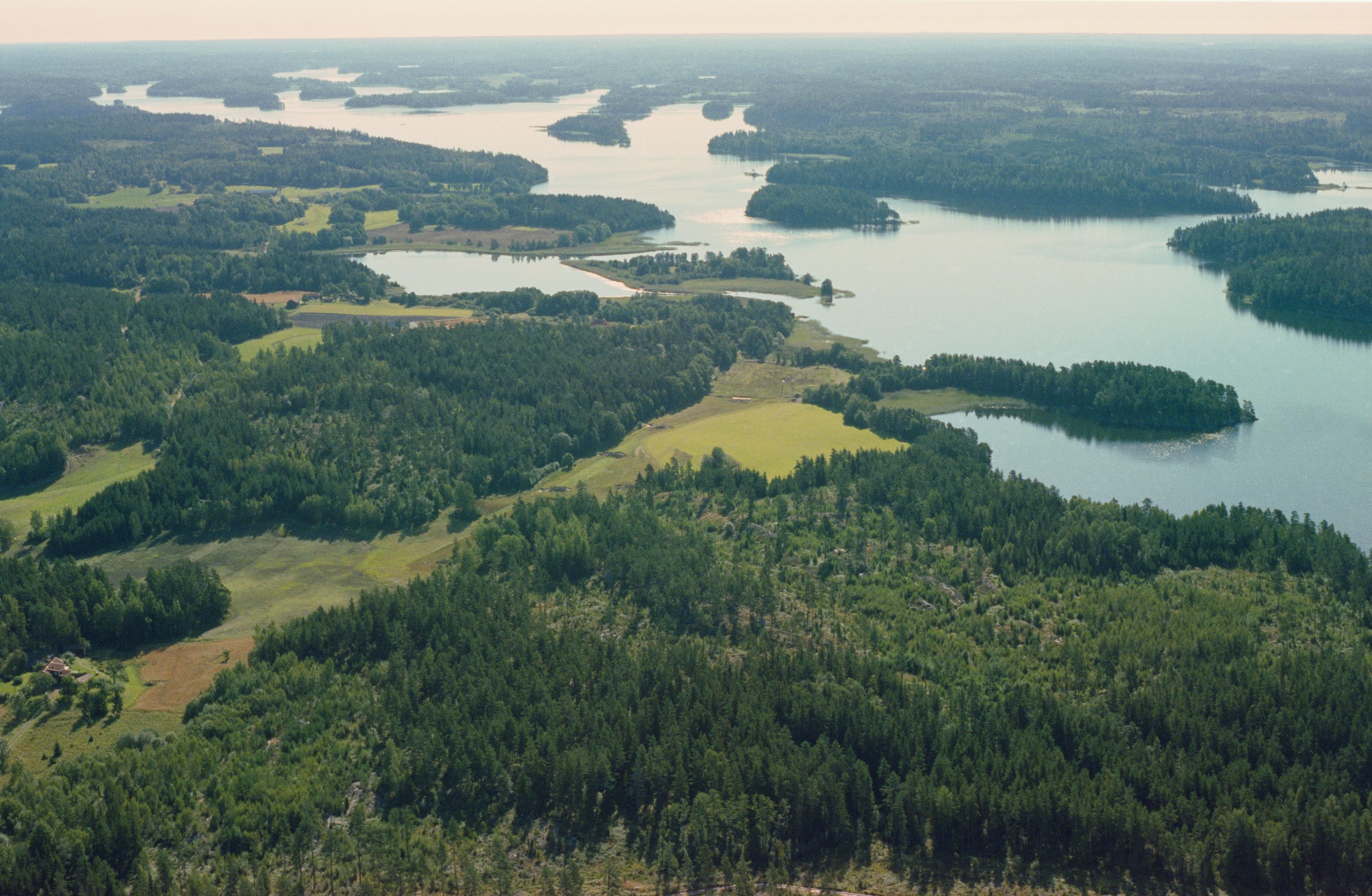 Beskrivning: Hyltingeö vid sjön Båven. I sjön går gränsen mellan socknen Hyltinge och Helgesta. Vid bildens mitt Pumphusudden och Saxängens herrgård. Bilden är tagen mot (väderstreck): SO