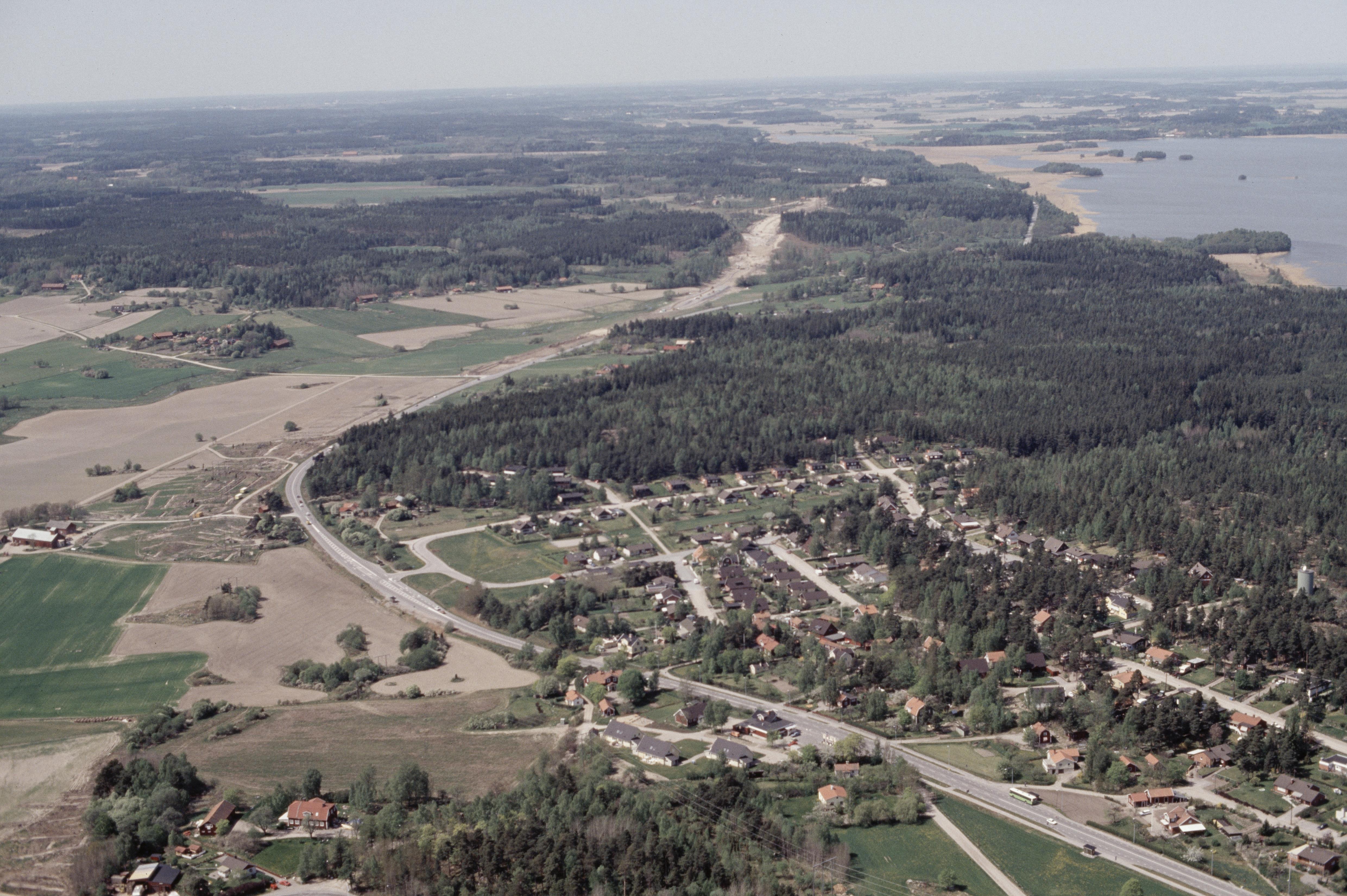 Beskrivning: Arkeologiska undersökningar innan vägbygge av E3 / E20 i området söder om Sörfjärden i Mälaren. Under bildens mitt Härads kyrka och kyrkby. Till vänster om bildens mitt grav- och boplats RAÄnr Härad 72:1, 82:1 m.fl. vid Kumla by. Bilden är tagen mot (väderstreck): V