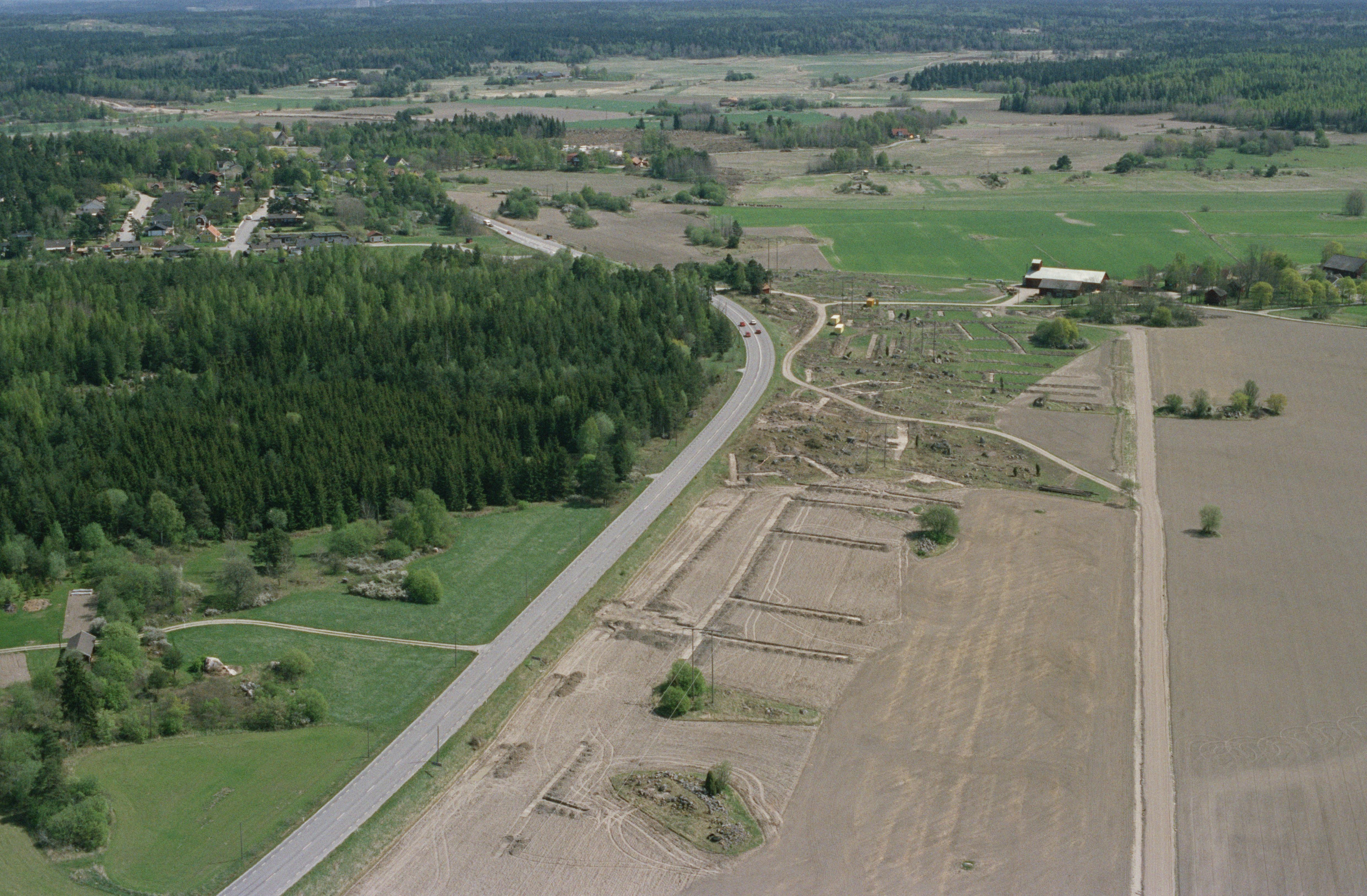 Beskrivning: Arkeologiska undersökningar innan vägbygge av E3 / E20 i området söder om Sörfjärden i Mälaren. Grav- och boplats RAÄnr Härad 72:1, 82:1 m.fl. vid Kumla by. Bilden är tagen mot (väderstreck): NO