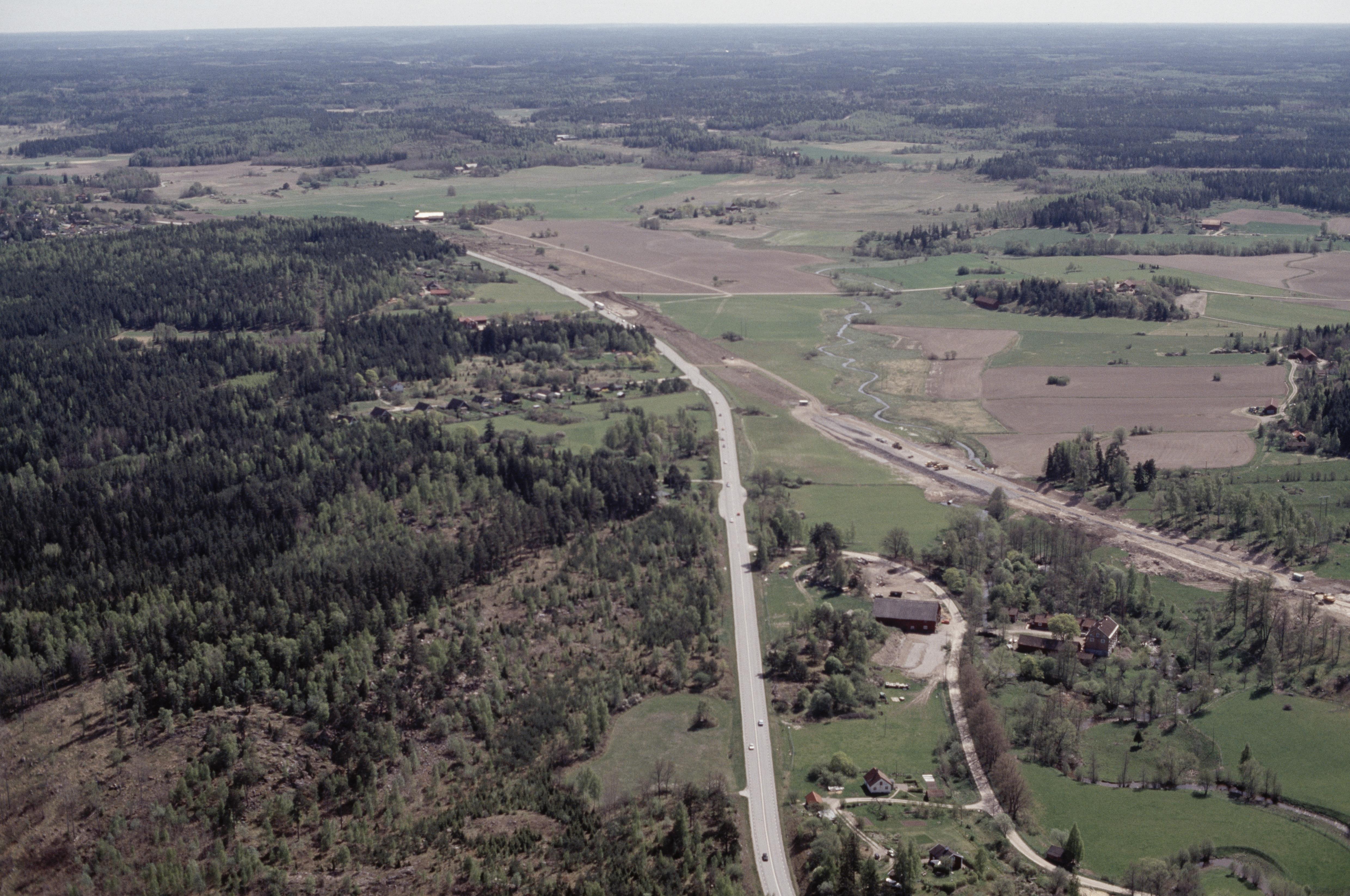 Beskrivning: Arkeologiska undersökningar innan vägbygge av E3 / E20 i området söder om Sörfjärden i Mälaren. Vid bildens mitt grav- och boplats RAÄnr Härad 77:1-3, 289 m.fl. vid Eksågs gård och Hagbyån. Bilden är tagen mot (väderstreck): Ö