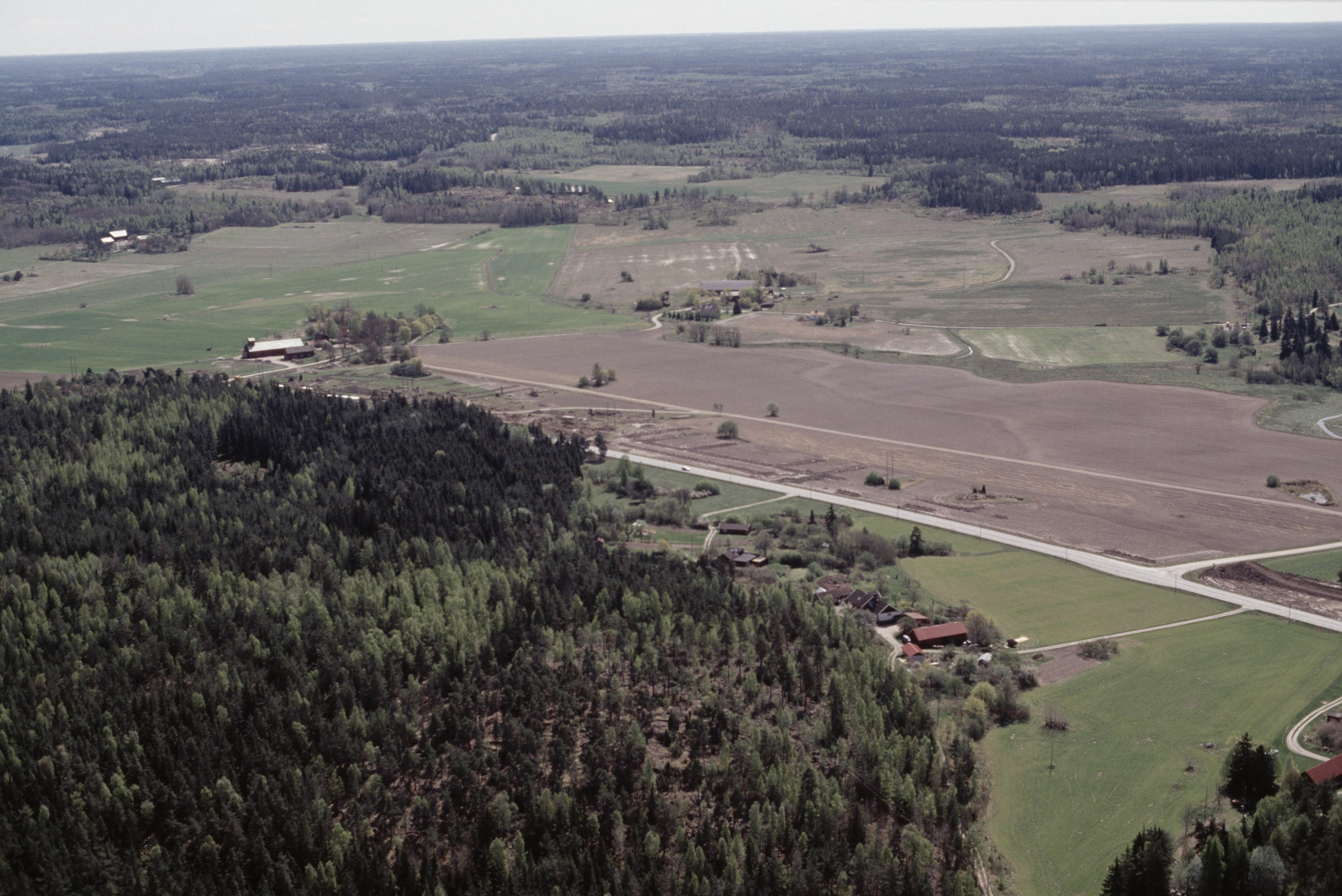 Beskrivning: Beskrivning: Arkeologiska undersökningar innan vägbygge av E3 / E20 i området söder om Sörfjärden i Mälaren. Vid bildens mitt grav- och boplats RAÄnr Härad 72:1, 82:1 m.fl. vid Kumla by. Bilden är tagen mot (väderstreck): SSO Fotosyfte: Flygbildsdokumentation