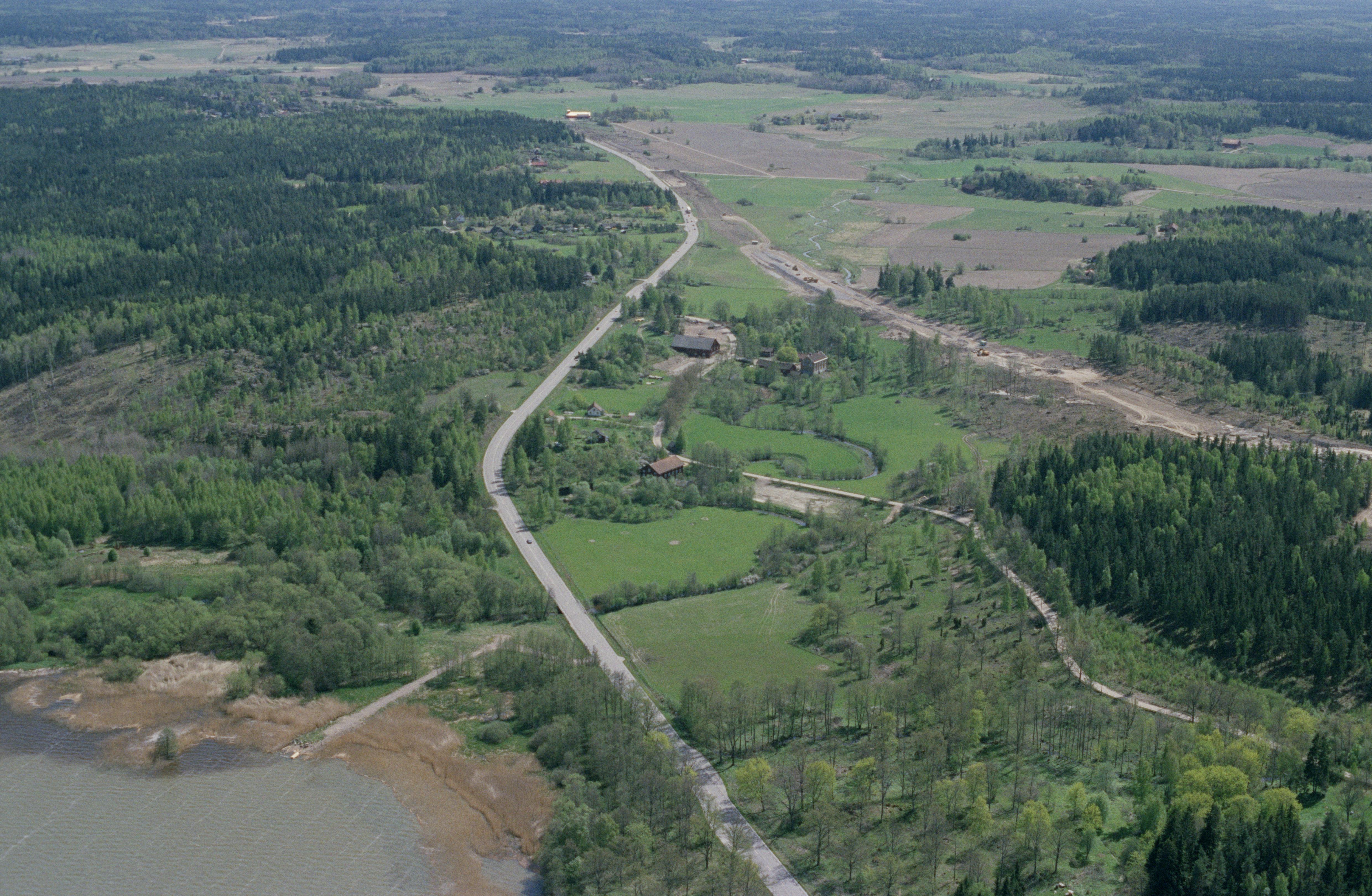 Beskrivning: Beskrivning: Arkeologiska undersökningar innan vägbygge av E3 / E20 i området söder om Sörfjärden i Mälaren. Vid bildens mitt grav- och boplats RAÄnr Härad 77:1-3, 289 m.fl. vid Eksågs gård och Hagbyån. Bilden är tagen mot (väderstreck): Ö Fotosyfte: Flygbildsdokumentation