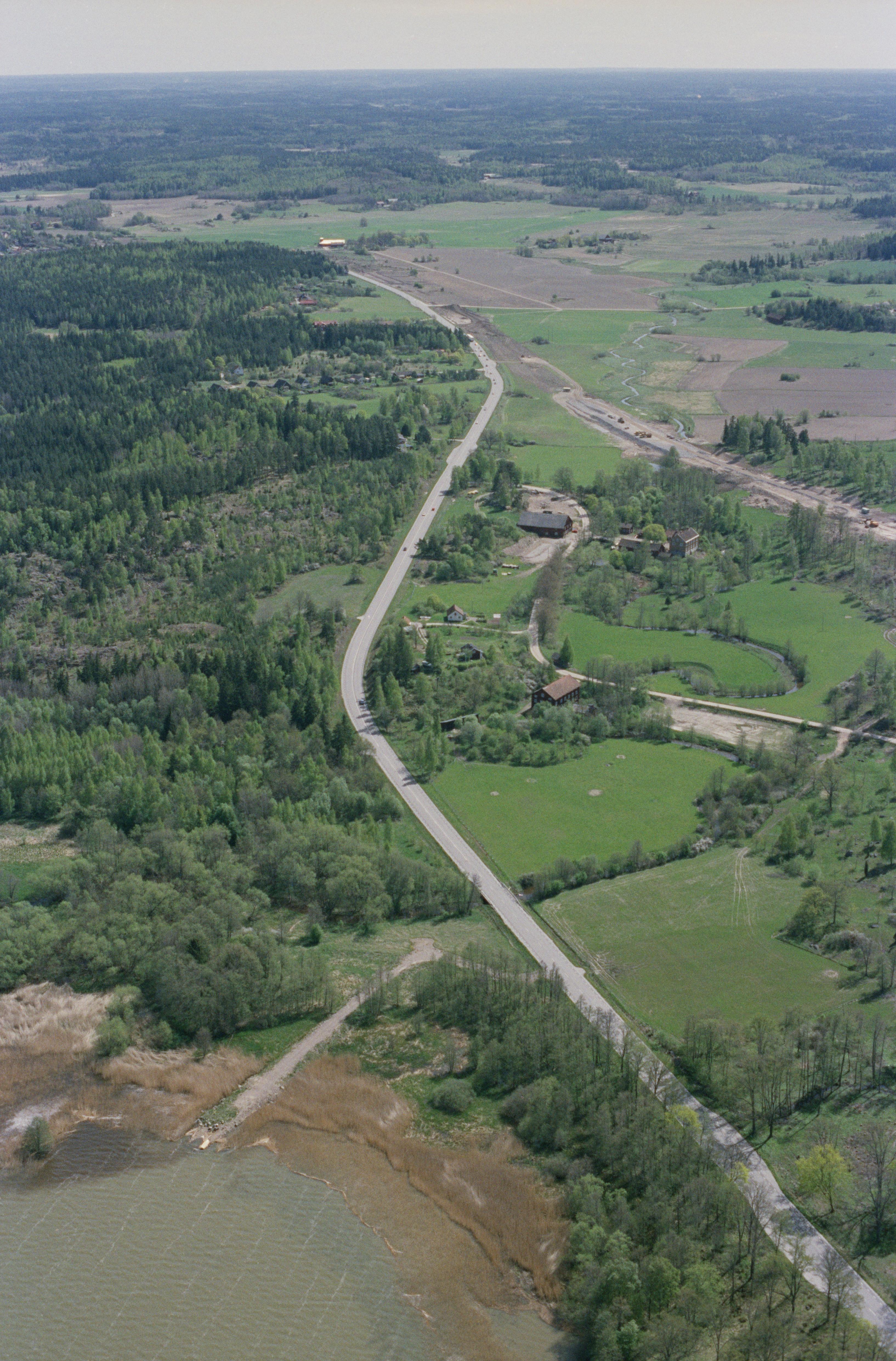 Beskrivning: Beskrivning: Arkeologiska undersökningar innan vägbygge av E3 / E20 i området söder om Sörfjärden i Mälaren. Vid bildens mitt grav- och boplats RAÄnr Härad 77:1-3, 289 m.fl. vid Eksågs gård och Hagbyån. Bilden är tagen mot (väderstreck): Ö Fotosyfte: Flygbildsdokumentation