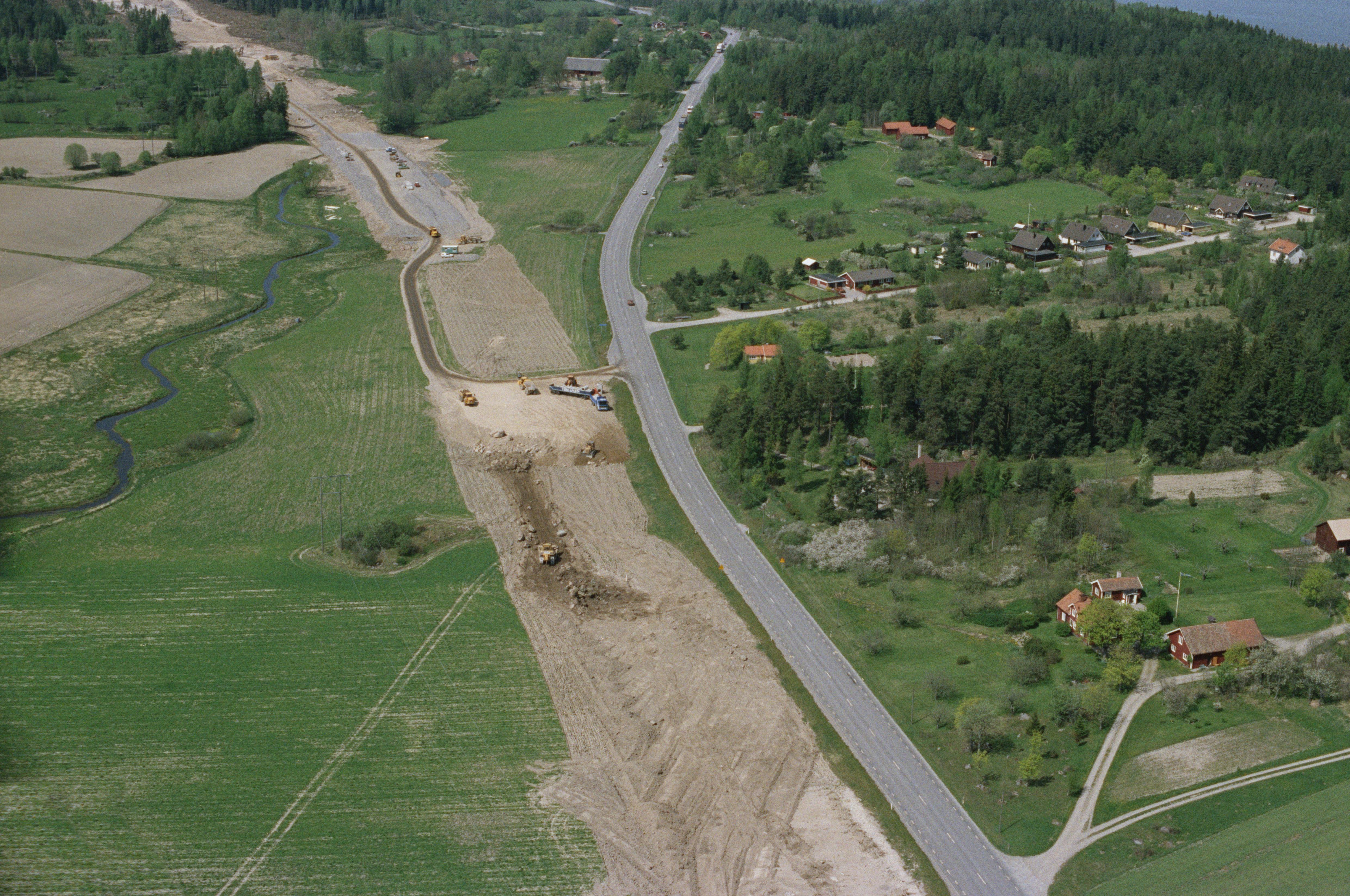 Beskrivning: Arkeologiska undersökningar innan vägbygge av E3 / E20 i området söder om Sörfjärden i Mälaren. Vid bildens mitt grav- och boplats RAÄnr Härad 80:2 m.fl. vid Hammartorps by. Hagbyån till vänster. I bildens övre del Eksåg. Bilden är tagen mot (väderstreck): NV
