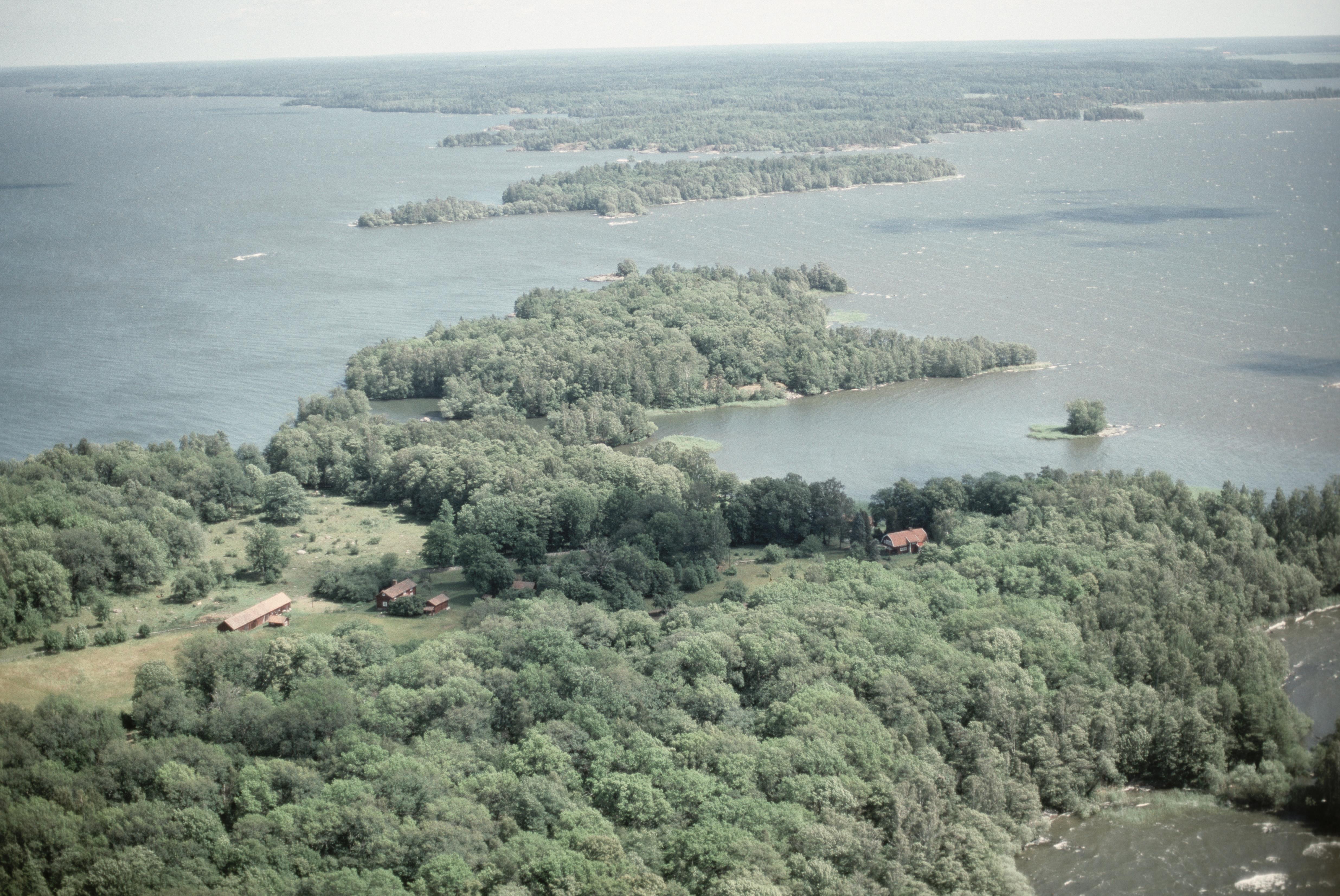 Beskrivning: Tåkenön (skrivs även Tockenön) är en ö i södra delen av sjön Hjälmaren med f.d. slåttermarker till Julita herrgård. Ön är sedan gammalt bebyggd med ett torp. I bildens övre del Lillön och Väsboön. Bilden är tagen mot (väderstreck): Ö