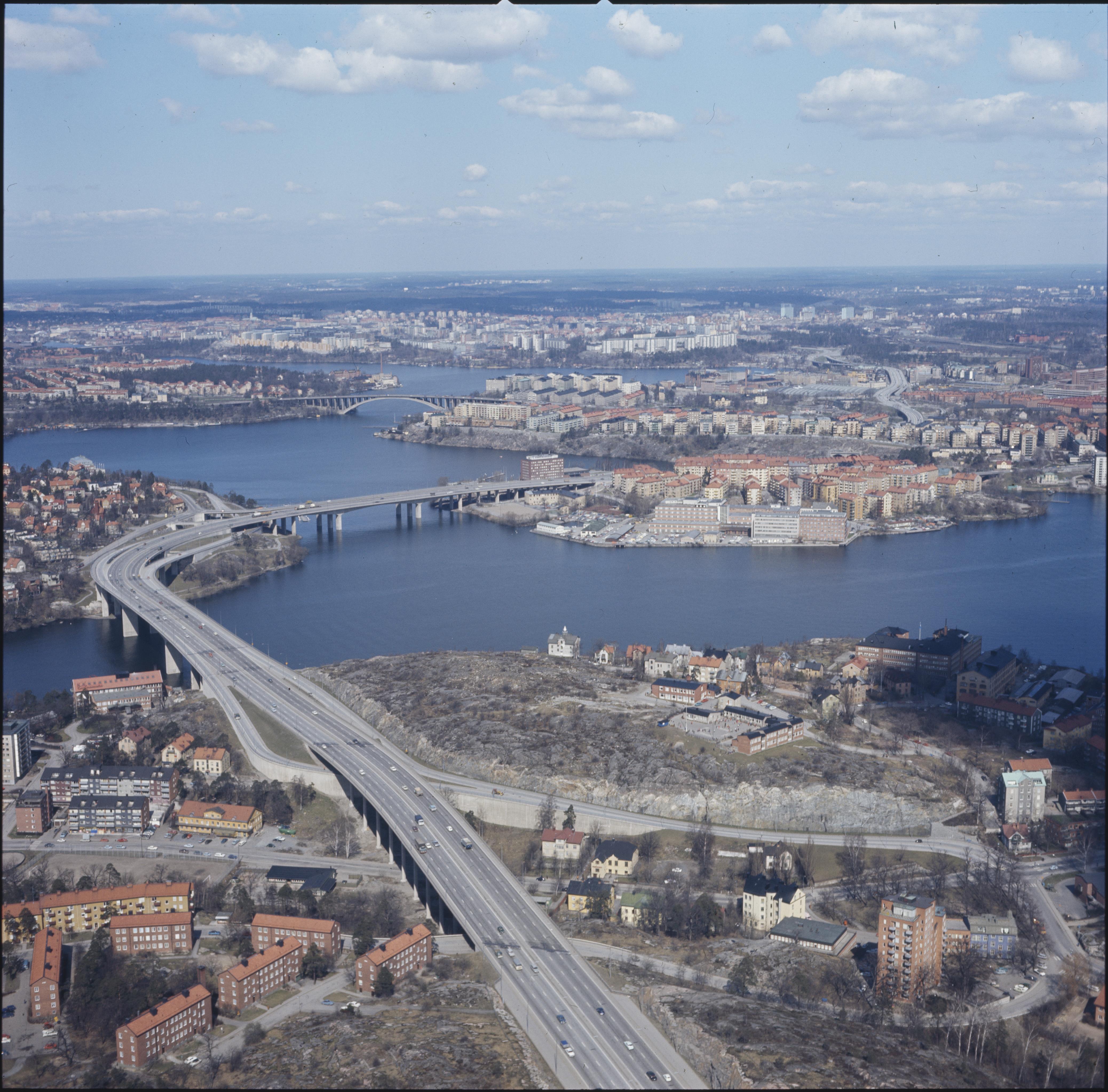 Beskrivning: Gröndal, Essingeöarna, Essingeleden. I bakgrunden Fredhäll och Tranebergsbron.
