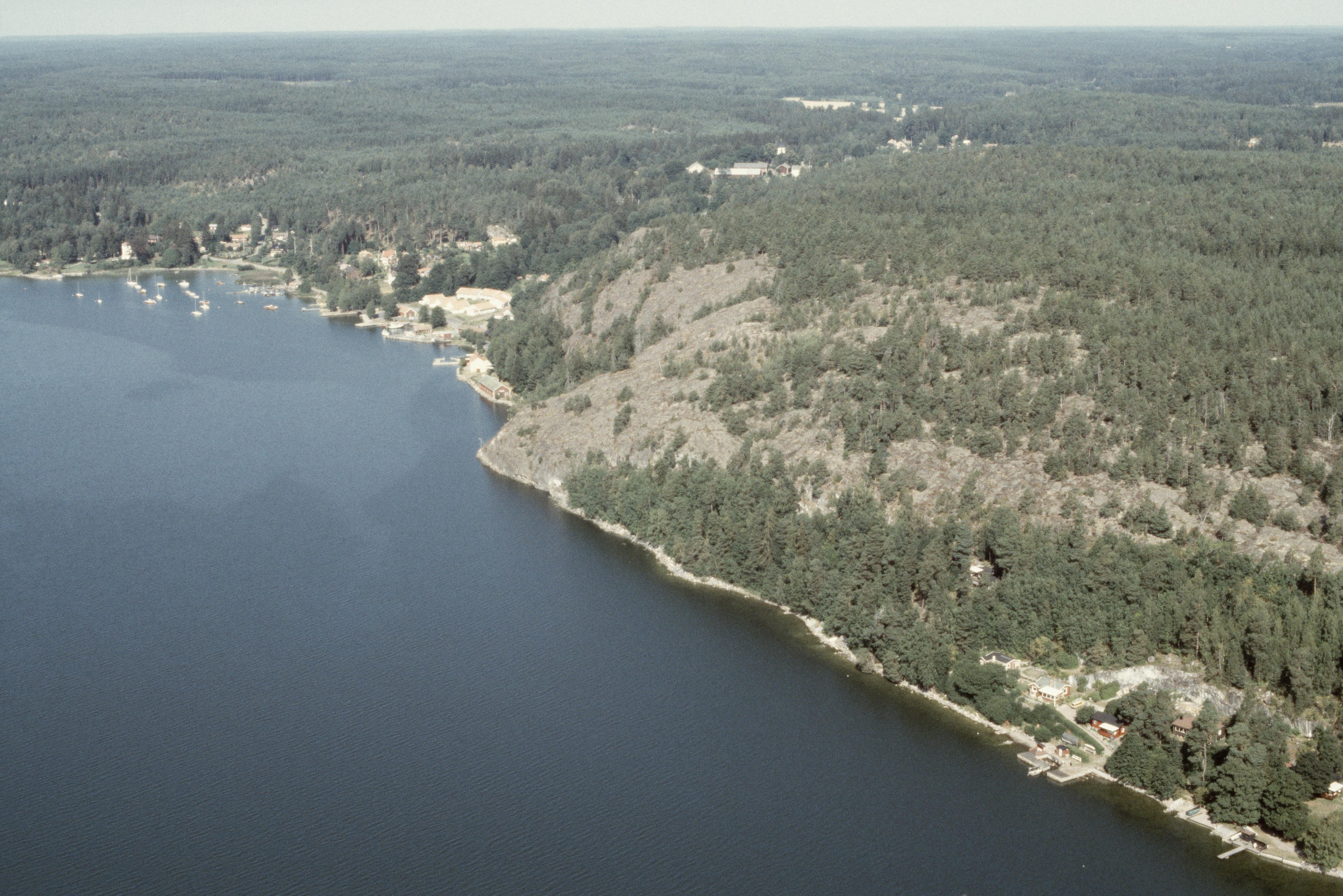 Beskrivning: Bråvikenbranten (kallas även Kolmårdsbranten) vid Bråviken. I bildens nedre del Djupvik. Vid bildens mitt vårdkase RAÄnr Kvarsebo 1:1. I bildens övre del Granvik och Kvarsebo kyrkby. Bilden är tagen mot (väderstreck): NV