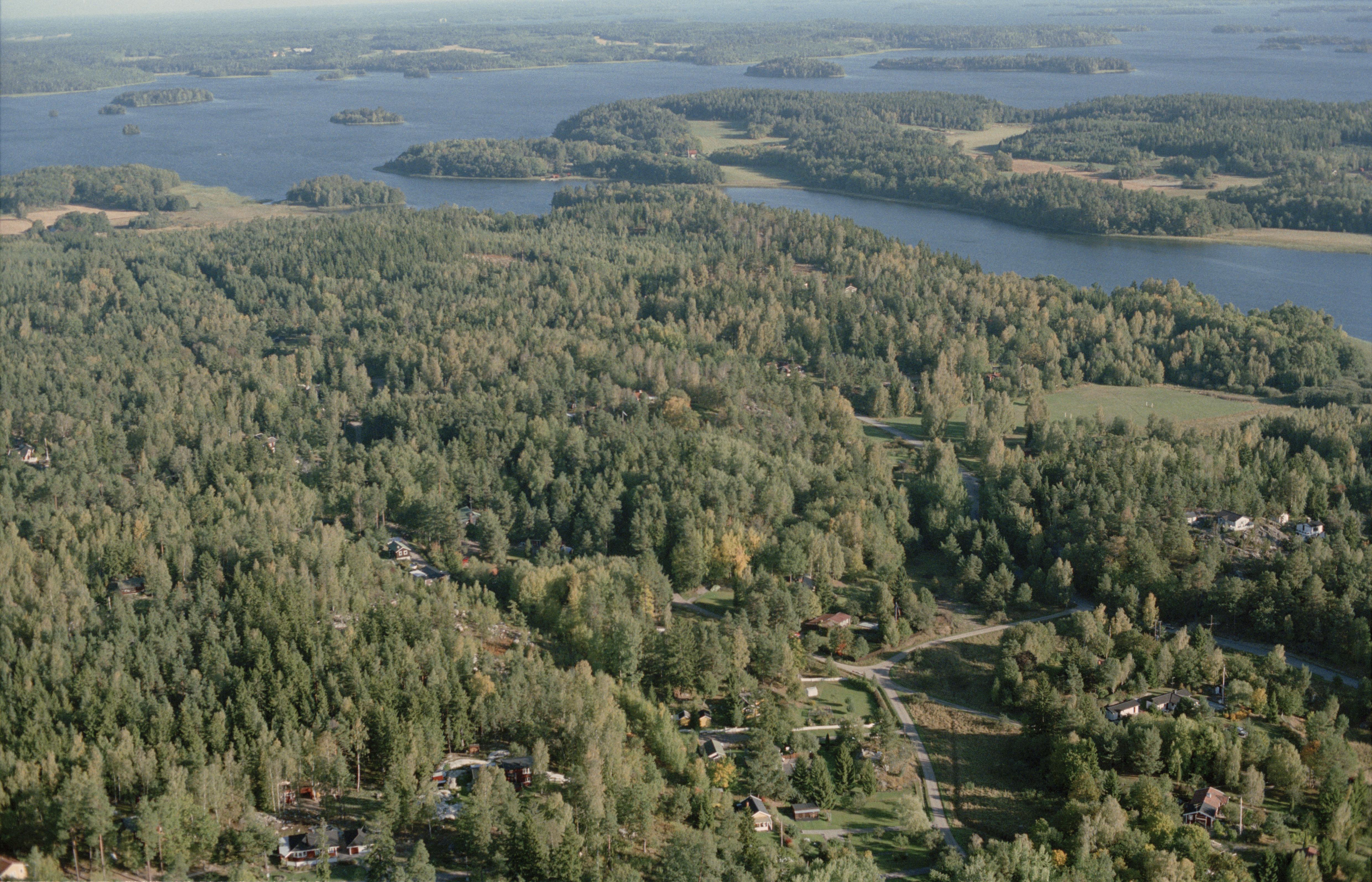 Beskrivning: Kalkuddens by mot Ramsö. Fornborg Kärnbo 124:1 vid Ramsösundet vid bildens mitt. Bilden är tagen mot (väderstreck): NO