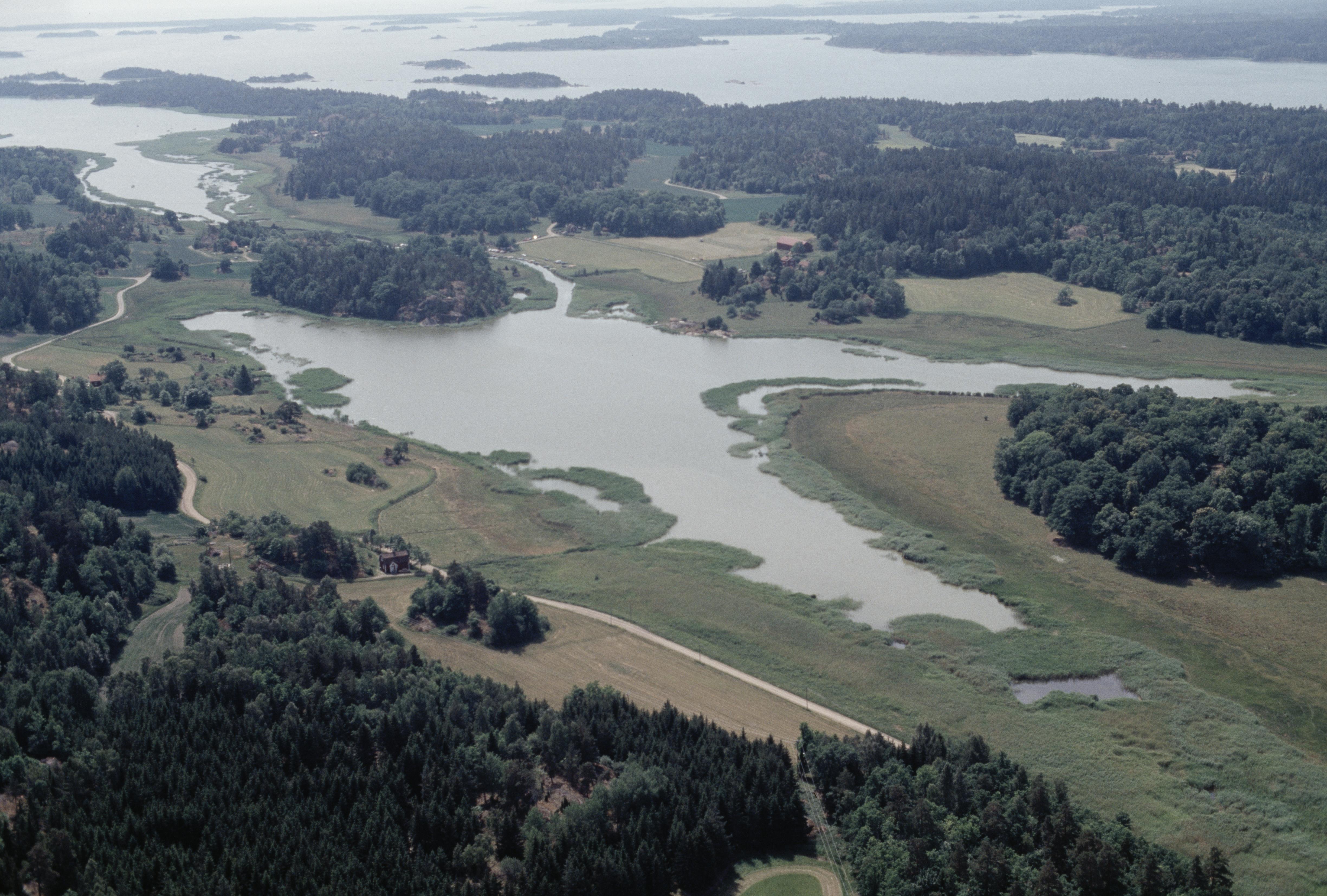 Beskrivning: Mörkö, södra delen. Nere till vänster Bobacken med lingrop RAÄnr Mörkö 136:1 på Mörkö. I bildens mitt Boviken och Eriksö gård. I bildens övre del Klubbsundet, Mörköfjärden och Gullberga. Bilden är tagen mot (väderstreck): SV