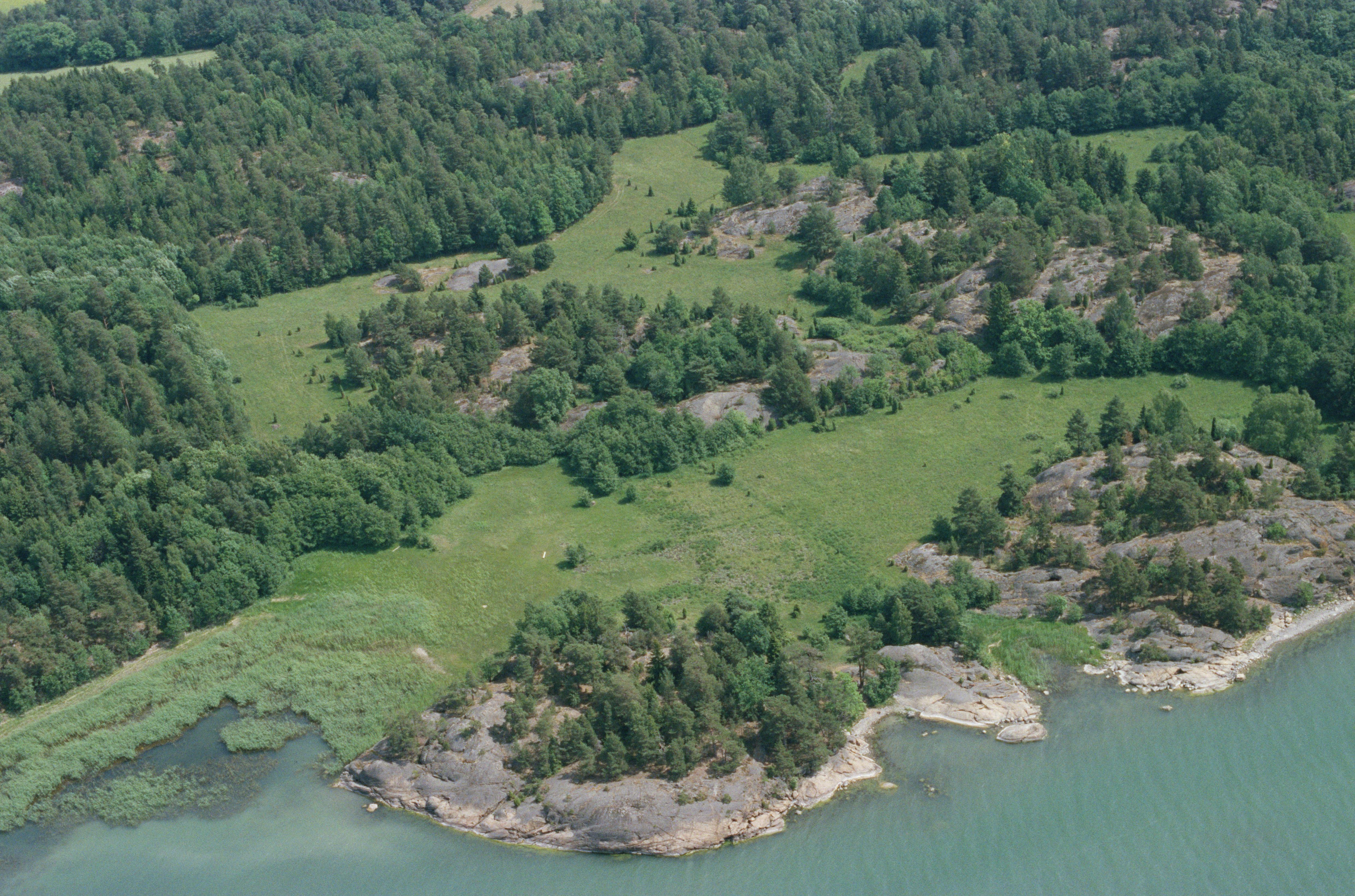 Beskrivning: Beskrivning: Eriksö, västra delen vid Mörköfjärden. Vid bildens mitt bebyggelselämningar RAÄnr Mörkö 139:1 vid Grönvik. Område med ängar. Badhusviken nere till vänster. Bilden är tagen mot (väderstreck): SO Fotosyfte: Flygbildsdokumentation