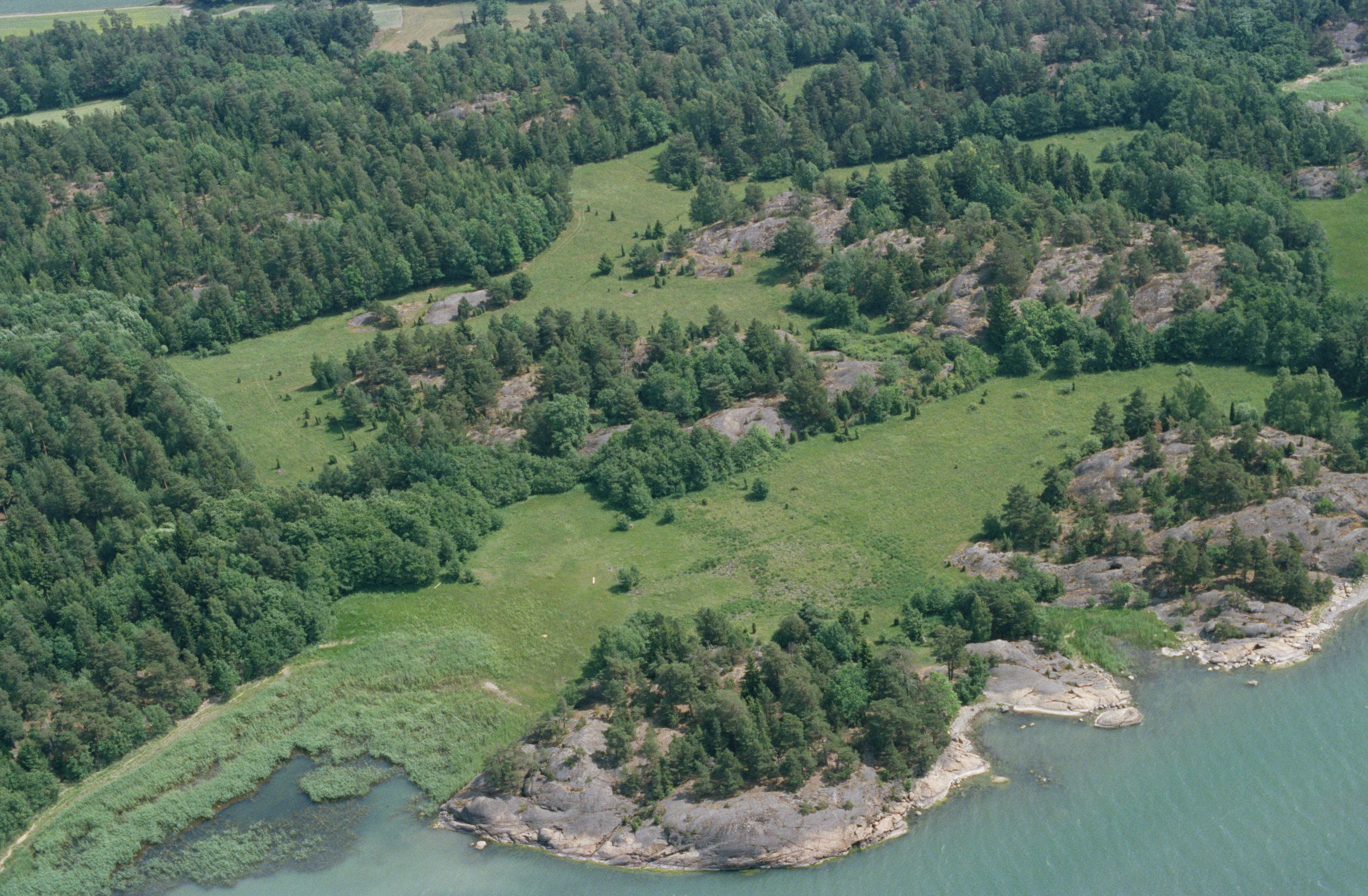 Beskrivning: Eriksö, västra delen vid Mörköfjärden. Vid bildens mitt bebyggelselämningar RAÄnr Mörkö 139:1 vid Grönvik. Område med ängar. Badhusviken nere till vänster. Bilden är tagen mot (väderstreck): SO