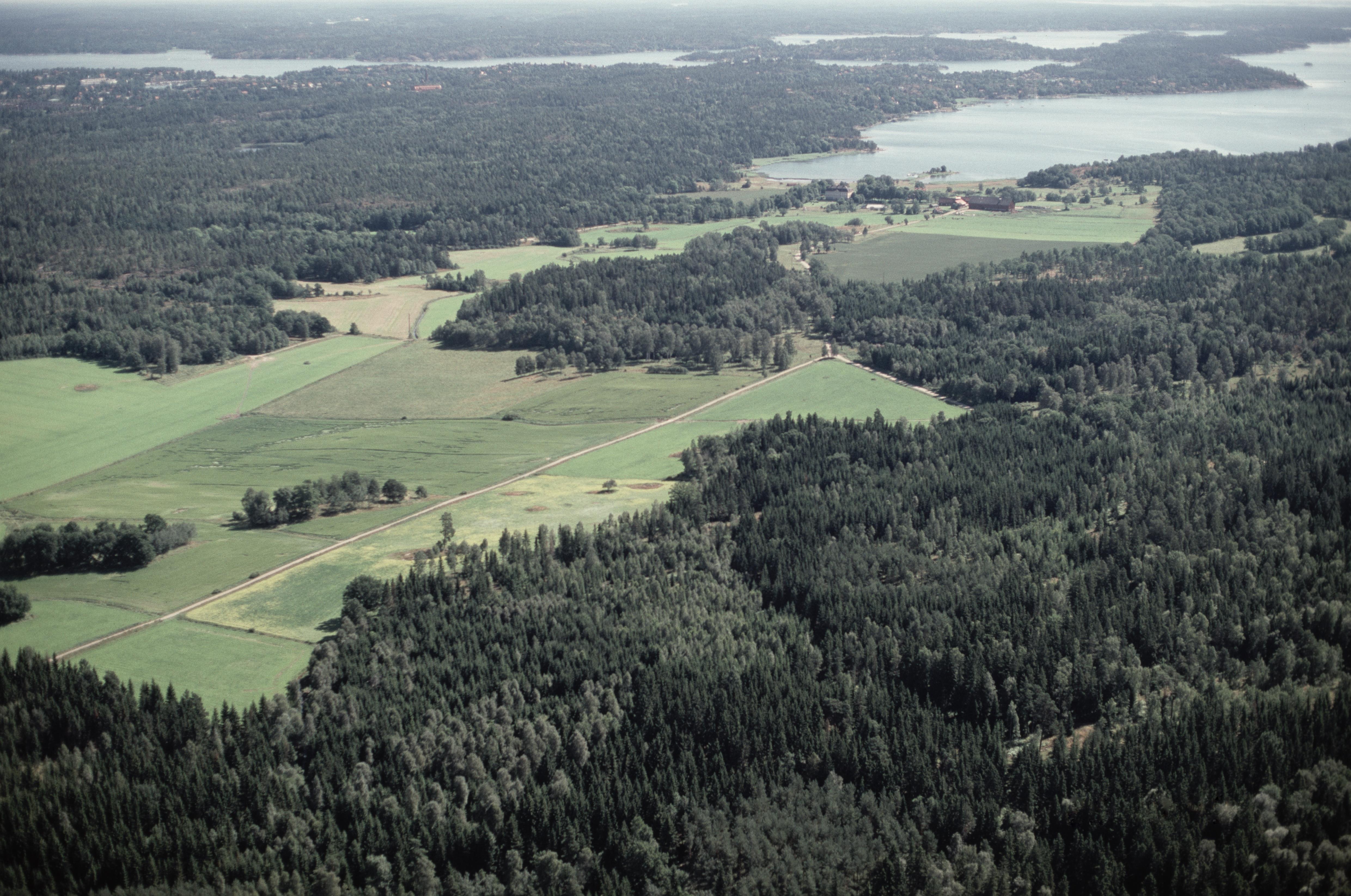 Beskrivning: Överby gamla tomt RAÄnr Nacka 33:1, gravfält Nacka 10:1 och gravhög Nacka 9:1-2 m.fl. I bildens övre del Erstaviks herrgård vid Erstaviken. Bilden är tagen mot (väderstreck): Ö