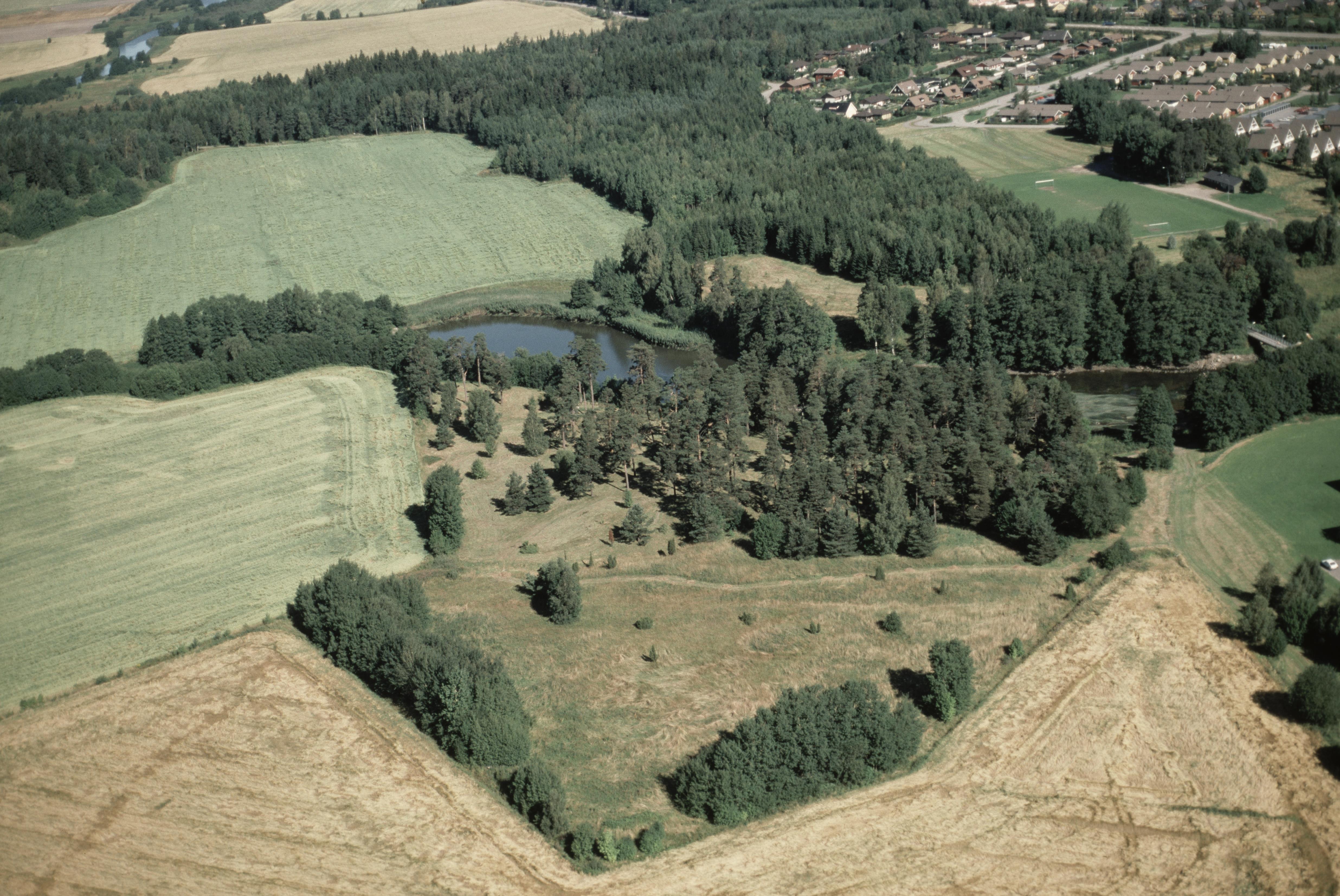 Beskrivning: Nyköpingsån markerar gränsen mellan socknen Nyköping och Helgona (i bildens övre del). Vid bildens mitt gravfält Släbro hage RAÄnr Nyköping 5:1. Oppebyskolan nere till höger. Bilden är tagen mot (väderstreck): N