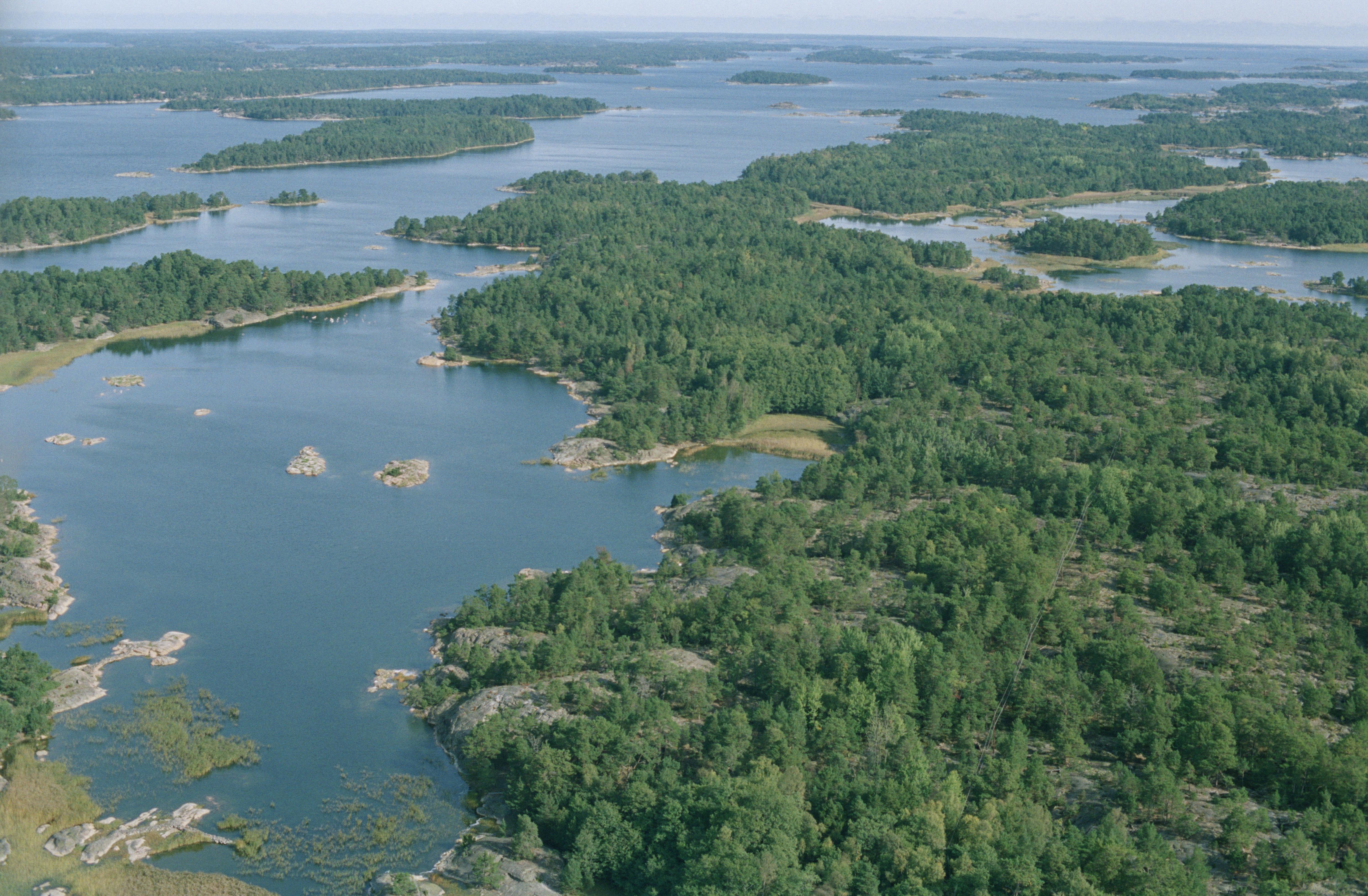 Beskrivning: Jungfruskärs naturreservat i Nämndöfjärden. Ön Jungfruskär med kringliggande öar och holmar. Till vänster viken Norra Fladen. Bilden är tagen mot (väderstreck): N