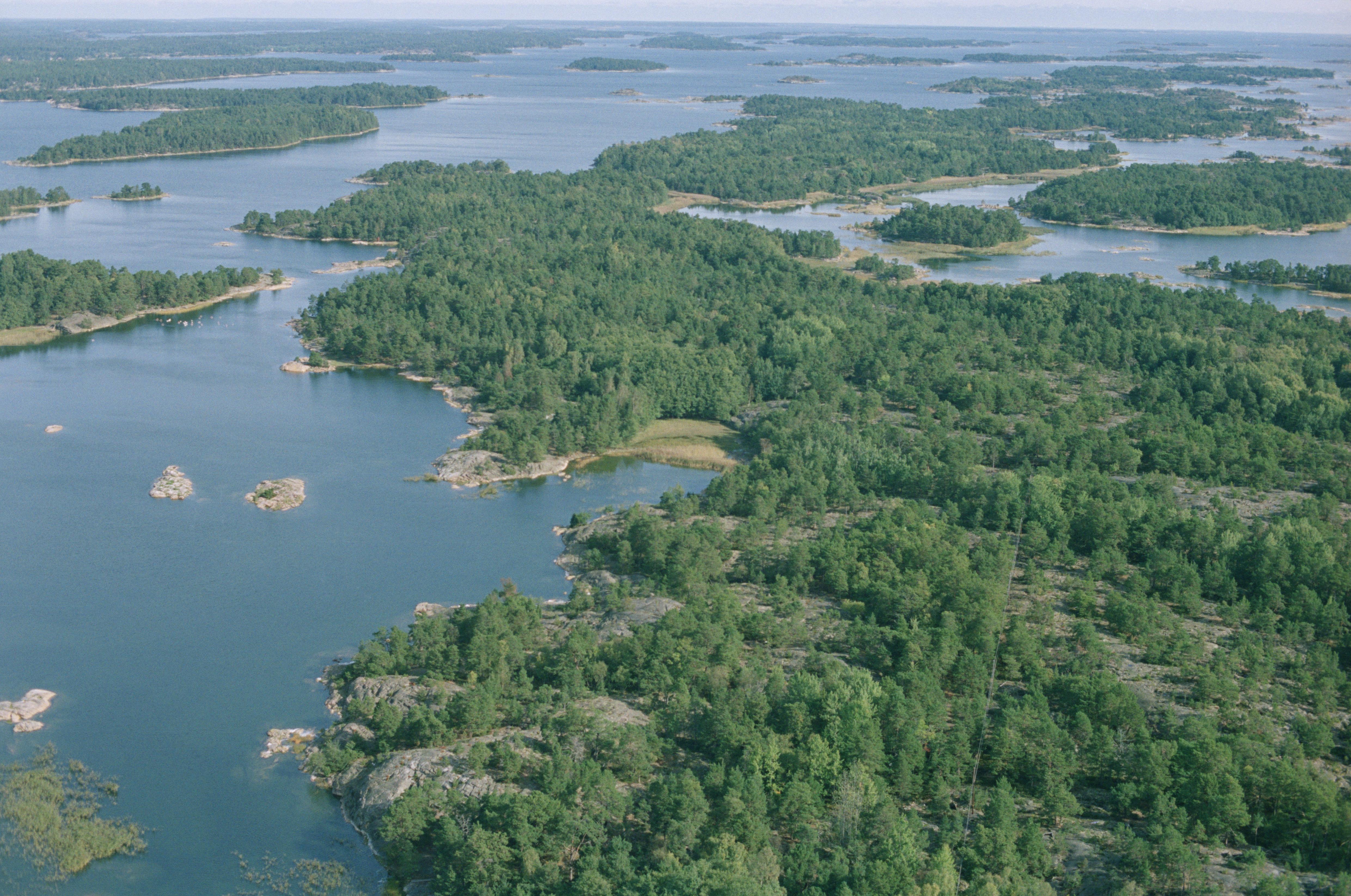 Beskrivning: Jungfruskärs naturreservat i Nämndöfjärden. Ön Jungfruskär med kringliggande öar och holmar. Till vänster viken Norra Fladen. Bilden är tagen mot (väderstreck): N