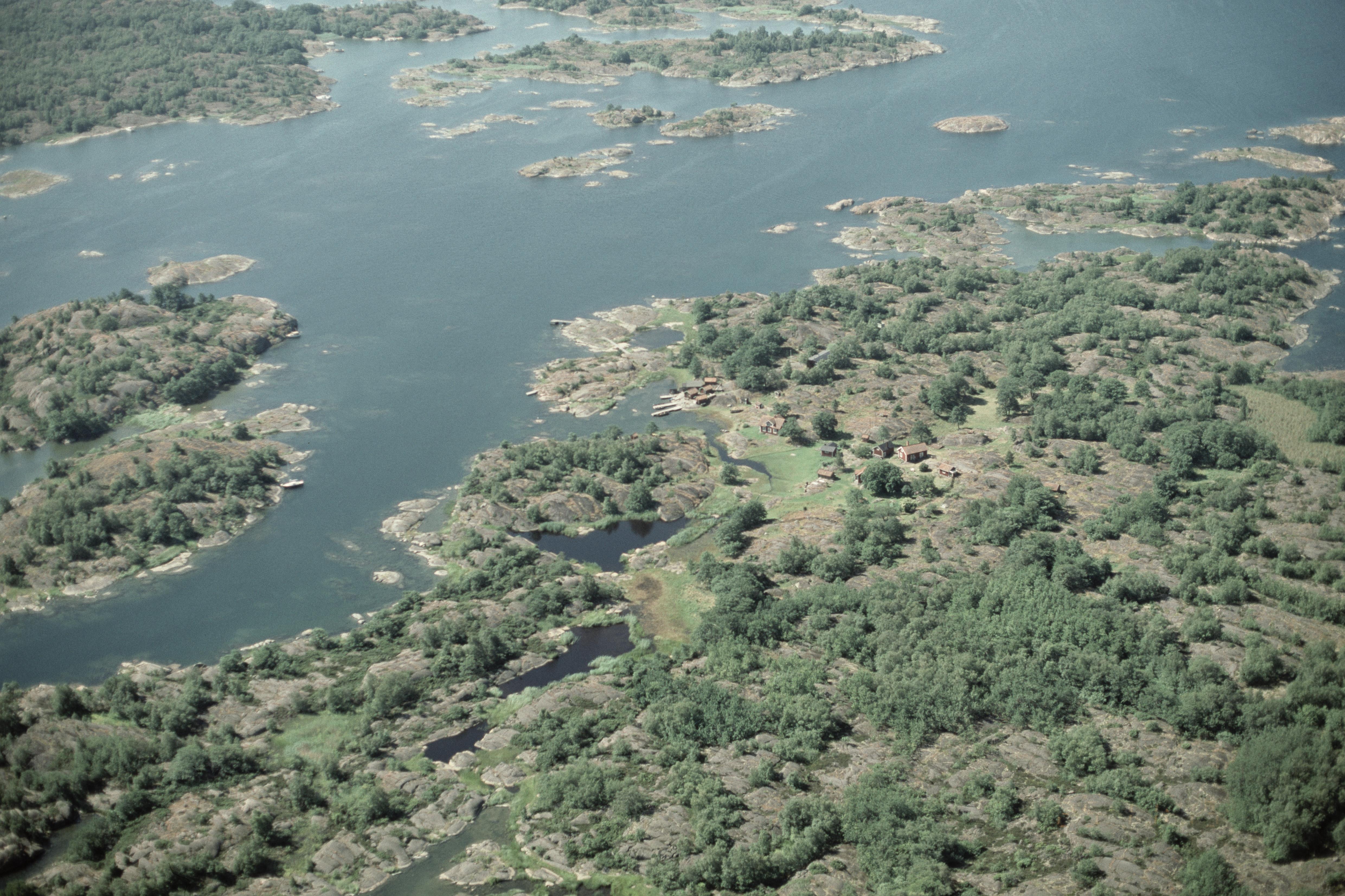 Beskrivning: Långviksskärs naturreservat i Nämndöfjärden. Ön Långviksskär med kringliggande öar och holmar. Under bildens mitt Långviksskärs by vid Björkströmmen. I bildens nedre del husgrund RAÄnr Nämdö 24:1. Bilden är tagen mot (väderstreck): SV