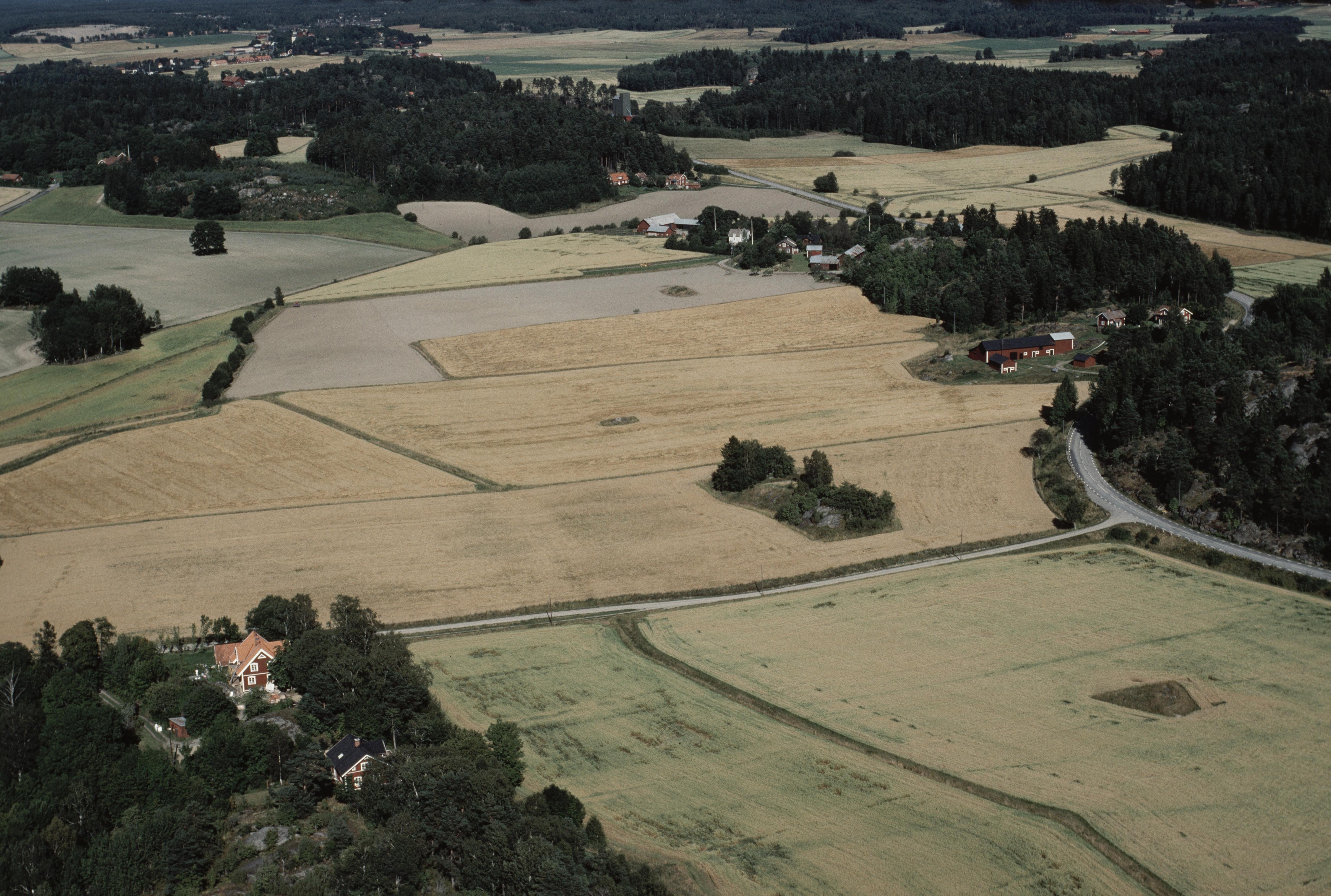 Beskrivning: Fornlämningsområde vid byarna Grimsta och Svalsta, Vid bildens mitt hällristningshäll RAÄnr Sorunda 785:1-5 m.fl. på åkerholme. Bilden är tagen mot (väderstreck): NO