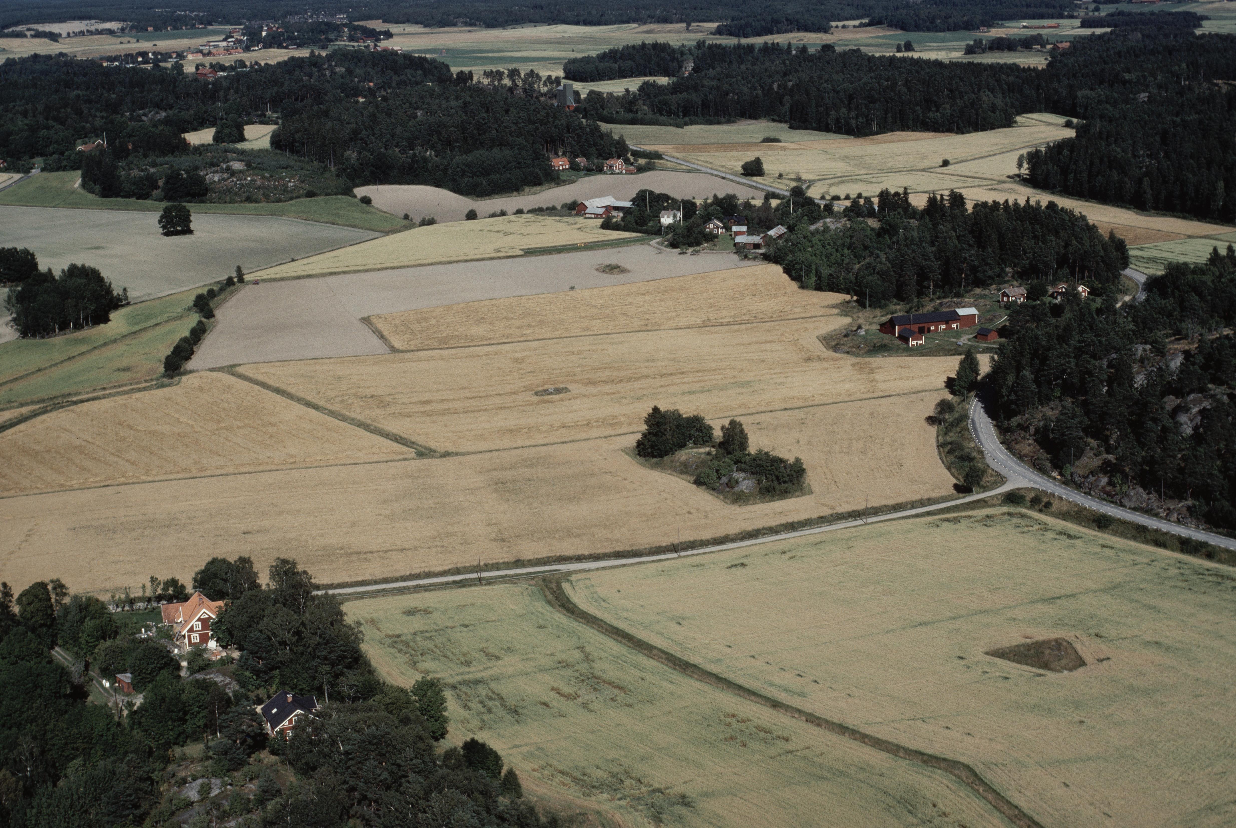 Beskrivning: Fornlämningsområde vid byarna Grimsta och Svalsta, Vid bildens mitt hällristningshäll RAÄnr Sorunda 785:1-5 m.fl. på åkerholme. Bilden är tagen mot (väderstreck): NO