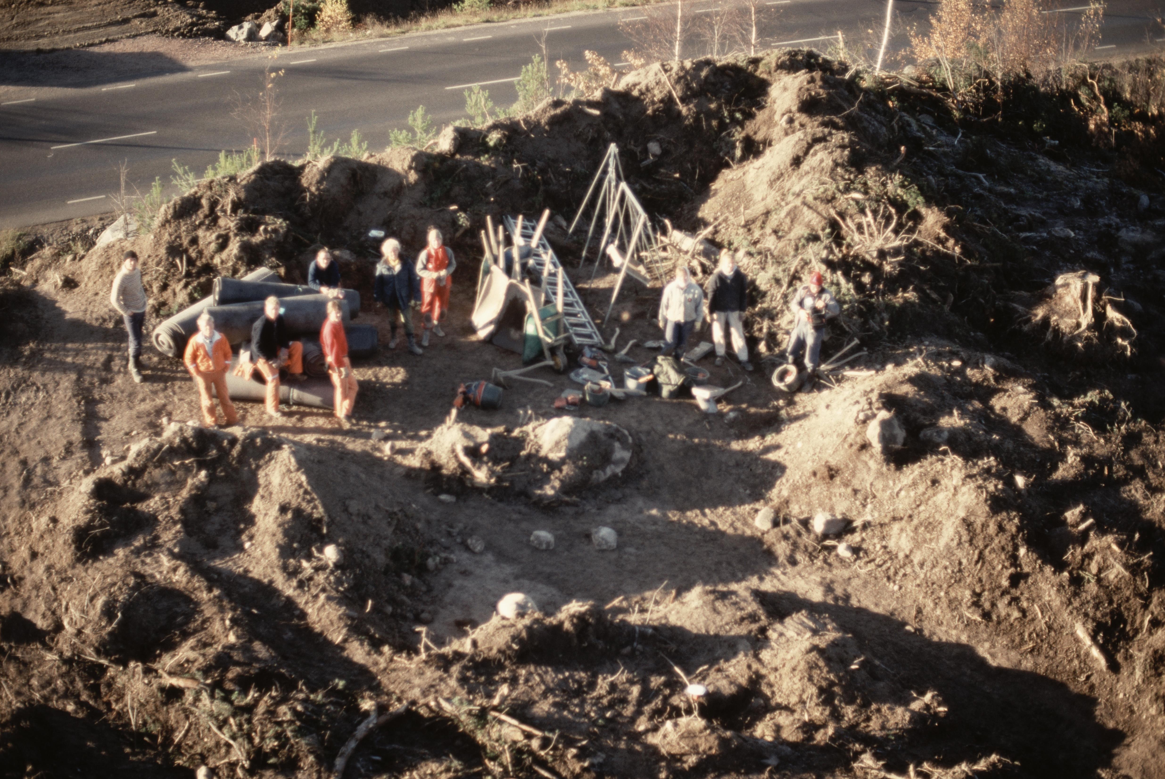 Beskrivning: Folkesta i nordvästra delen av tätorten Hällbybrunn. Vid bildens mitt arkeologisk undersökning av grav- och boplats RAÄnr Torshälla 145:1 innan nybyggnation. Bilden är tagen mot (väderstreck): V