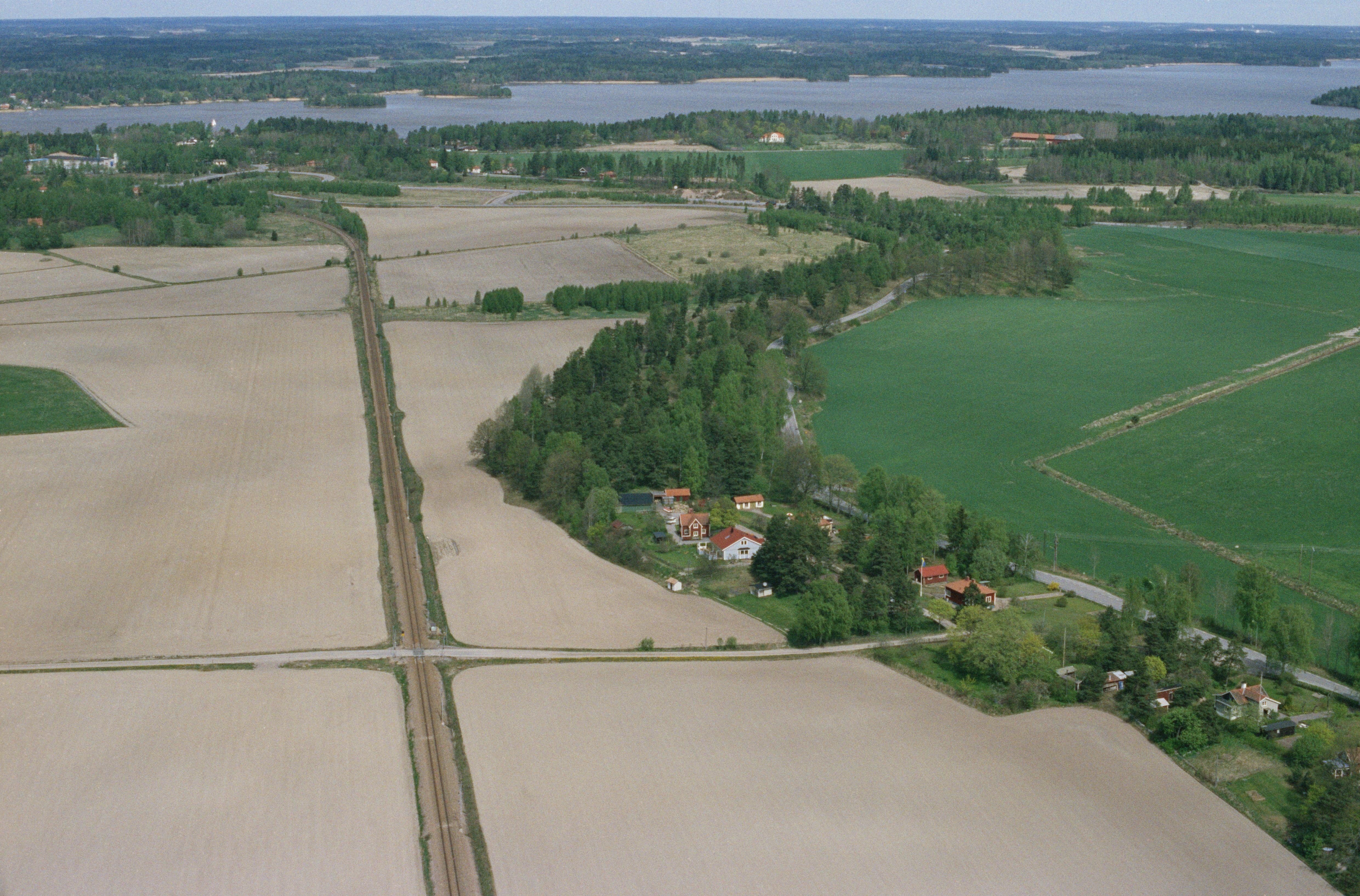 Beskrivning: Norra delen av Tumbo tätort. Uppe till höger gravfält RAÄnr Tumbo 48:1 på Tumboåsen. Mälaren i bildens övre del. Bilden är tagen mot (väderstreck): N