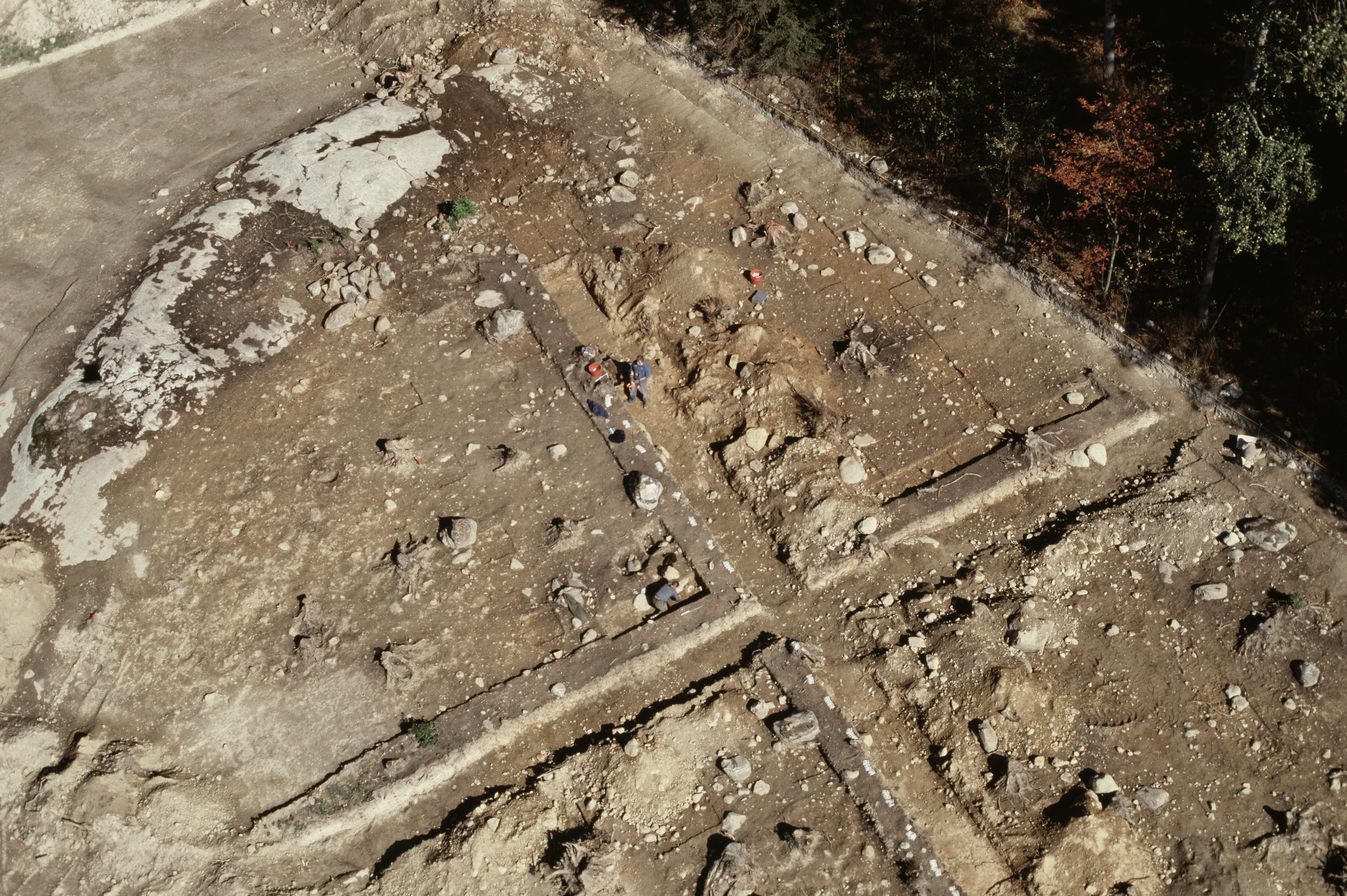 Beskrivning: Arkeologisk undersökning innan järnvägen Grödingebanan byggs vid Kvedesta by. Fornborg Tveta 44:1 vid Rådjursbacken. Bilden är tagen mot (väderstreck): NO