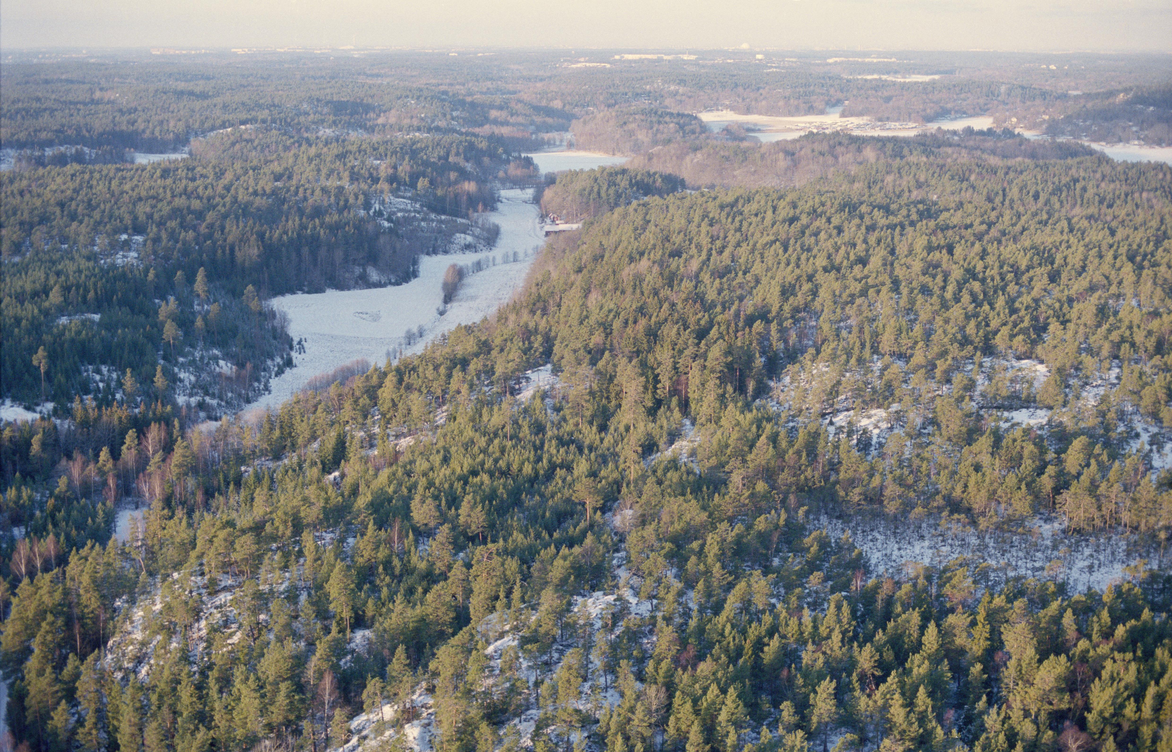 Beskrivning: Vissvassdalen norrväst om Vissvass by i Tyresta naturreservat. Till vänster om bildens mitt boplats Tyresö 131:1. I bildens övre del Mörkdalen. Bilden är tagen mot (väderstreck): VNV
