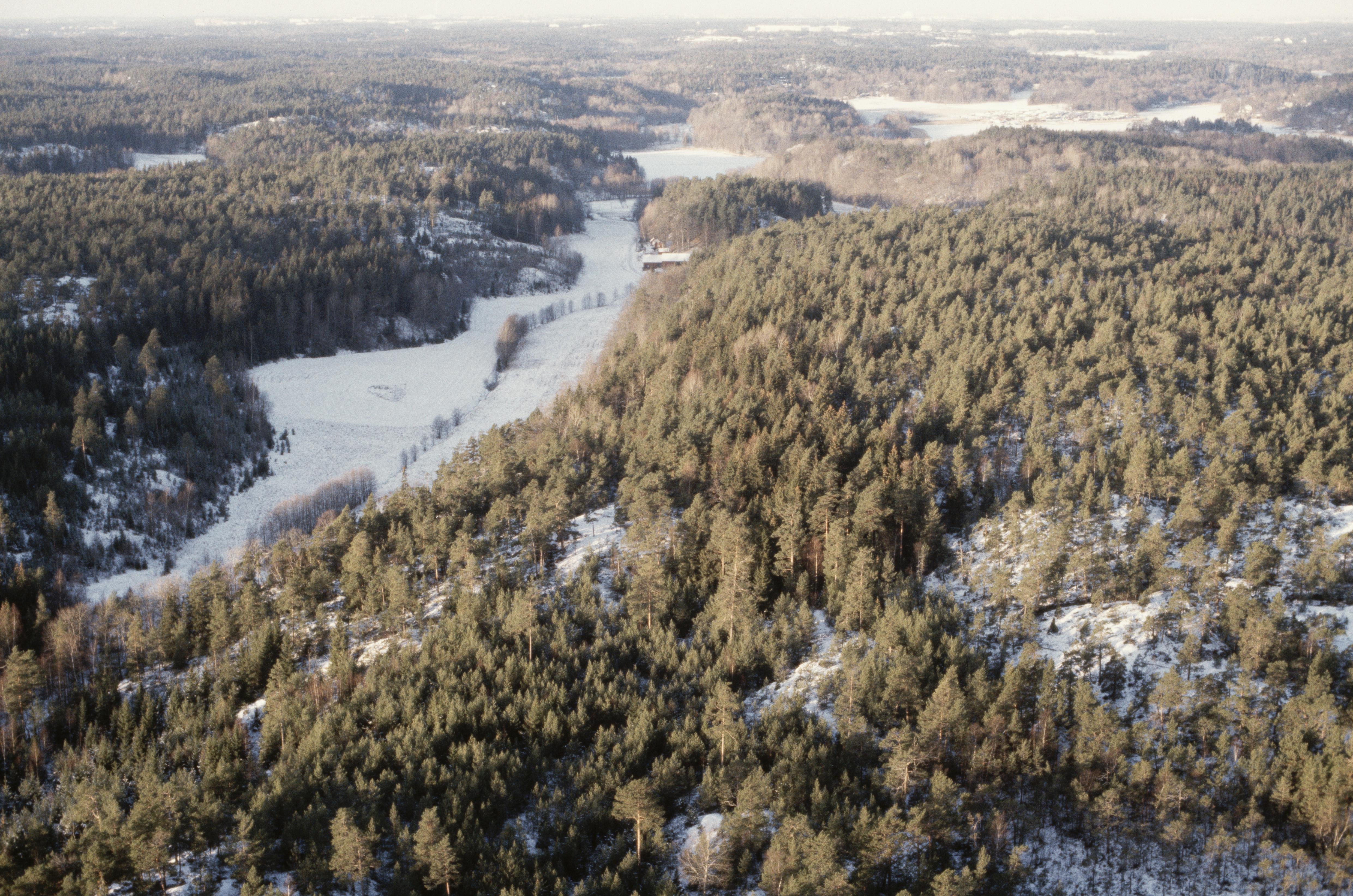 Beskrivning: Vissvassdalen norrväst om Vissvass by i Tyresta naturreservat. Till vänster om bildens mitt boplats Tyresö 131:1. I bildens övre del Mörkdalen. Bilden är tagen mot (väderstreck): VNV