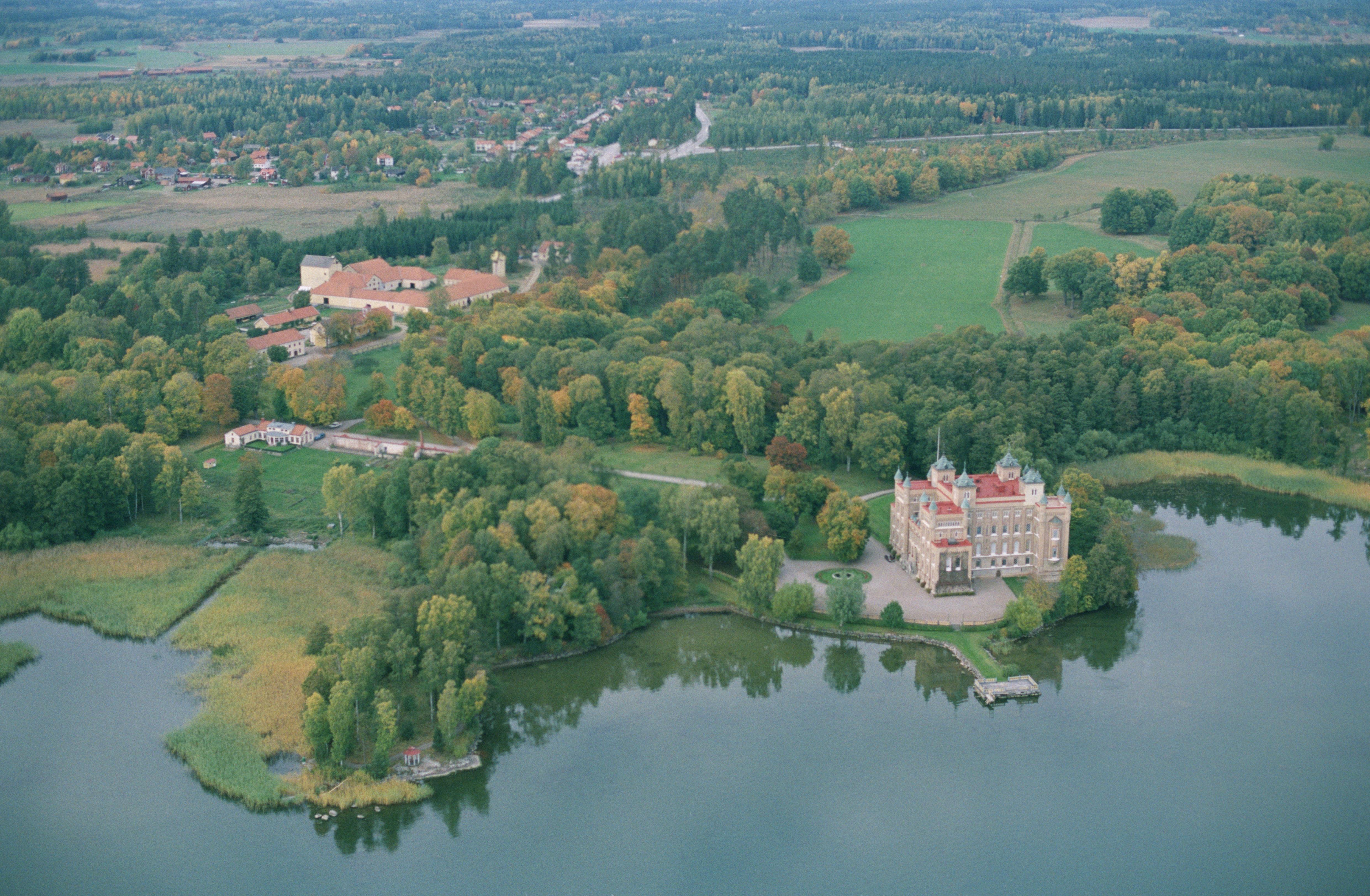Beskrivning: Stora Sundby slott, byggnadsminne RAÄnr Öja 58:1, vid Slottsviken i nordöstra delen av sjön Hjälmaren. I bildens övre del Alberga tätort vid gränsen mot Västermo socken. Bilden är tagen mot (väderstreck): N
